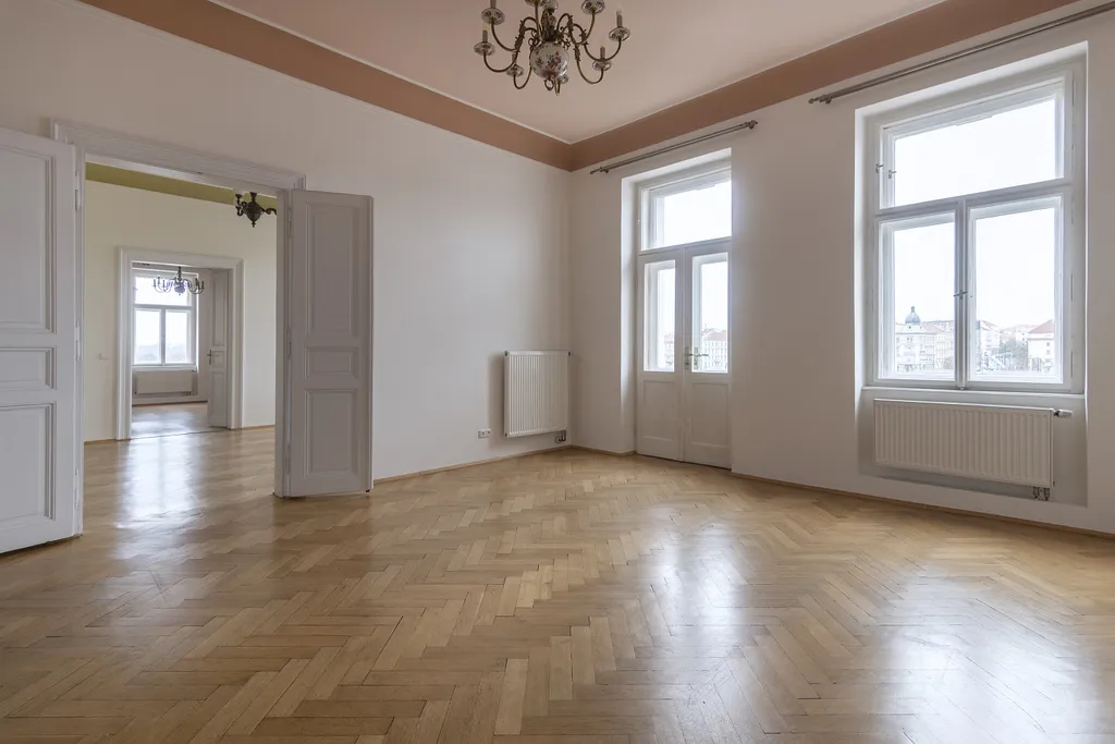 Nabízíme k pronájmu krásný a velmi prostorný byt 5+1, 205 m², ve 2. patře novorenesančního činžovního domu na rohu ulic Lidická a Hořejší nábřeží v Praze 5. K dispozici je pět velkých pokojů, které poskytují nádherné výhledy na Pražský hrad, Národní divadlo, Vyšehrad a povodí Vltavy, dva z pokojů mají vlastní balkón směrem k řece Vltavě, jeden balkón již zařízen příjemným posezením. V bytě je dále plně vybavená samostatná kuchyň (lednice, mrazák, myčka, sporák s troubou a digestoří, mikrovlnka) se spíží a vstupem na balkón orientovaný do klidného vnitrobloku, koupelna s vanou s sprchovým koutem, samostatná toaleta s umývátkem, dvě komory a velká vstupní chodba. Byt se nabízí nezařízený kromě kuchyňské linky se spotřebiči, pračky v koupelně a starožitné vestavné skříně v jednom z pokojů. Na podlaze kombinace původních dubových parket a dlažby. Dřevěná špaletová okna, vysoké stropy a mnoho historických detailů činí tento byt unikátním. Vytápění a ohřev vody plynovým kotlem. K dispozici optika pro připojení internetu. Samotný dům v minulosti rovněž citlivě renovován s důrazem na zachování původních prvků, bez výtahu.