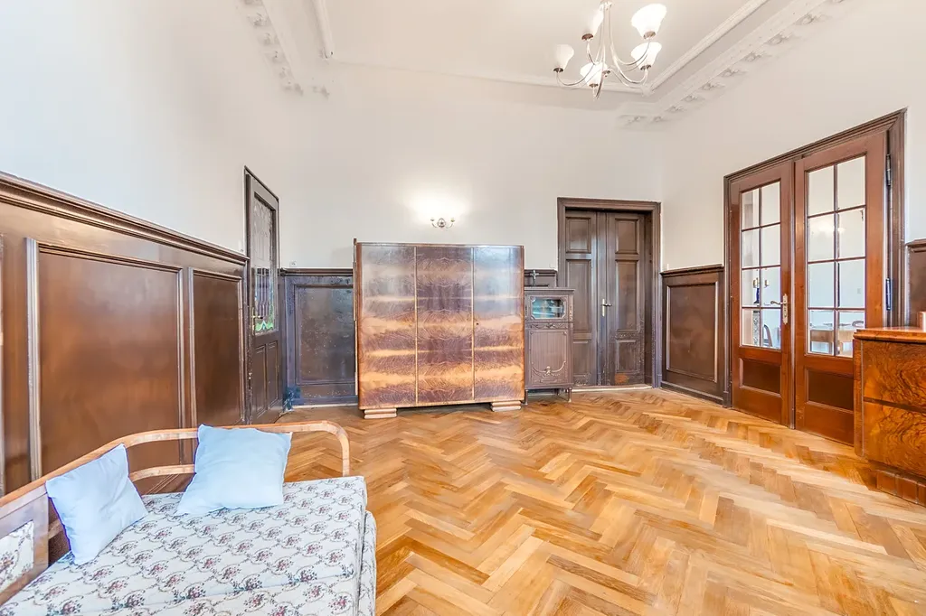 Byt je částečně vybaven prvorepublikovým nábytkem v obytných místnostech, krásnými kachlovými kamny (nejsou funkční). Podlahy renovované parkety a původní dlažba. Okna jsou již nová plastová včetně žaluzií a kuchyňská linka moderní včetně spotřebičů.