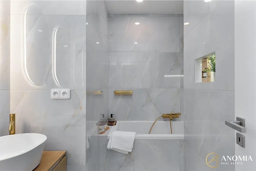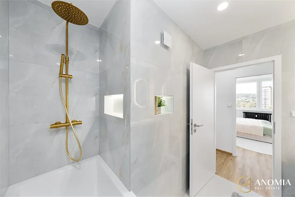 V bytě dále najdete 3 samostatné, neprůchozí pokoje, které lze využít jako ložnici, dětské pokoje nebo pracovnu, koupelnou, oddělené WC a technickou místností s místem na pračku i sušičku. Koupelna zaujme elegantním designem – velkoformátové obklady, podsvětlené niky a kvalitní materiály vytvářejí nadčasový a harmonický dojem.