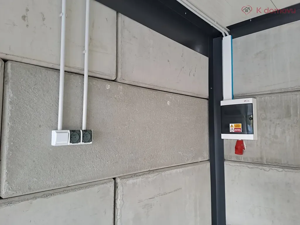 V garáži je třífázové zapojení do sítě, rozvod 230 V se zásuvkami a led osvětlením. Garážová sekční vrata s elektromotorem na dálkové ovládání, a separátní digitální měřič spotřeby energie.