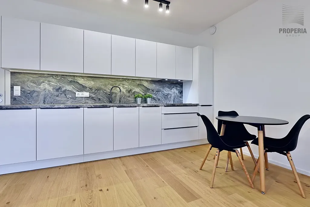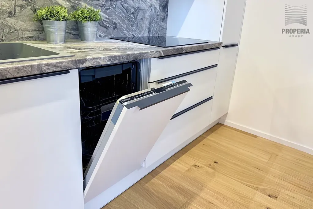 Byt je vybaven kuchyňskou linkou na míru v moderních neutrálních barvách, spotřebiči jako myčka, lednice, digestoř, mikrovlnná trouba a pračka. Vestavná skříň v předsíni nabízí dostatek úložného prostoru. Koupelna je vybavena sprchovým koutem, závěsným WC, umyvadlem.