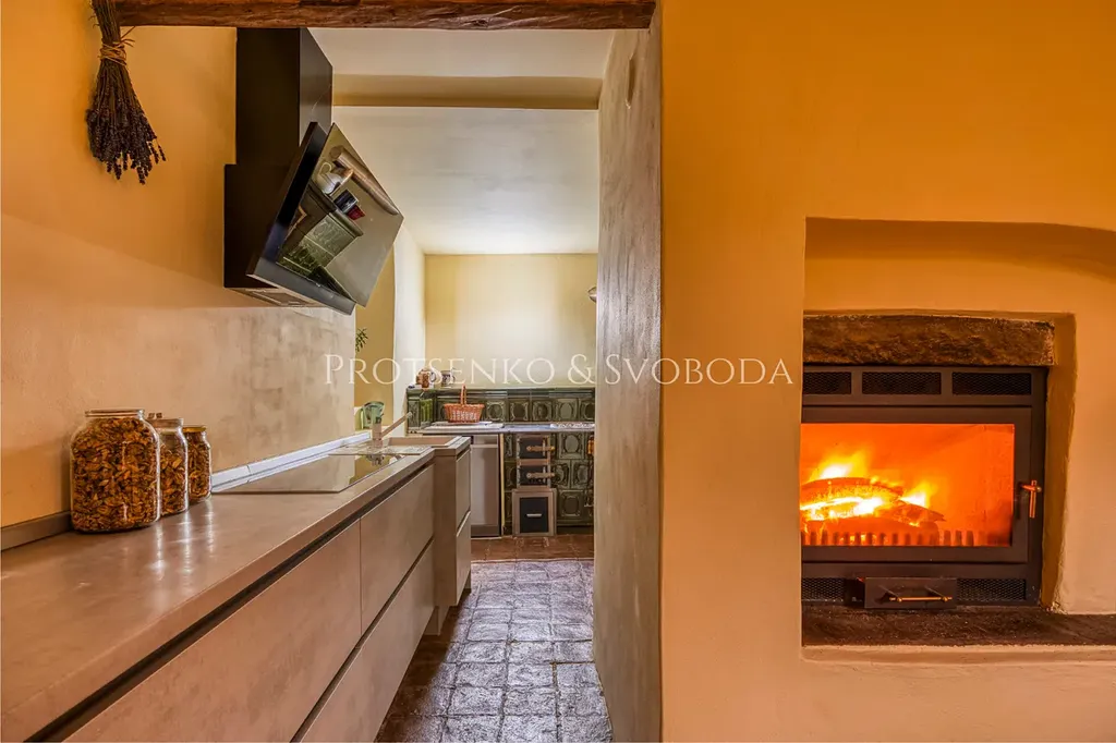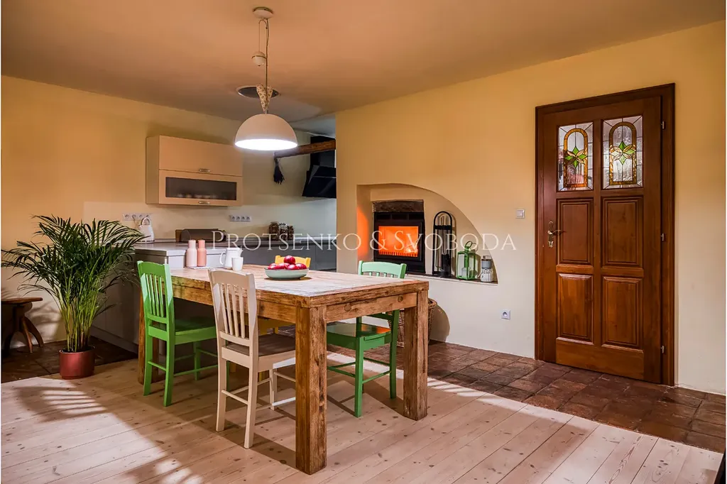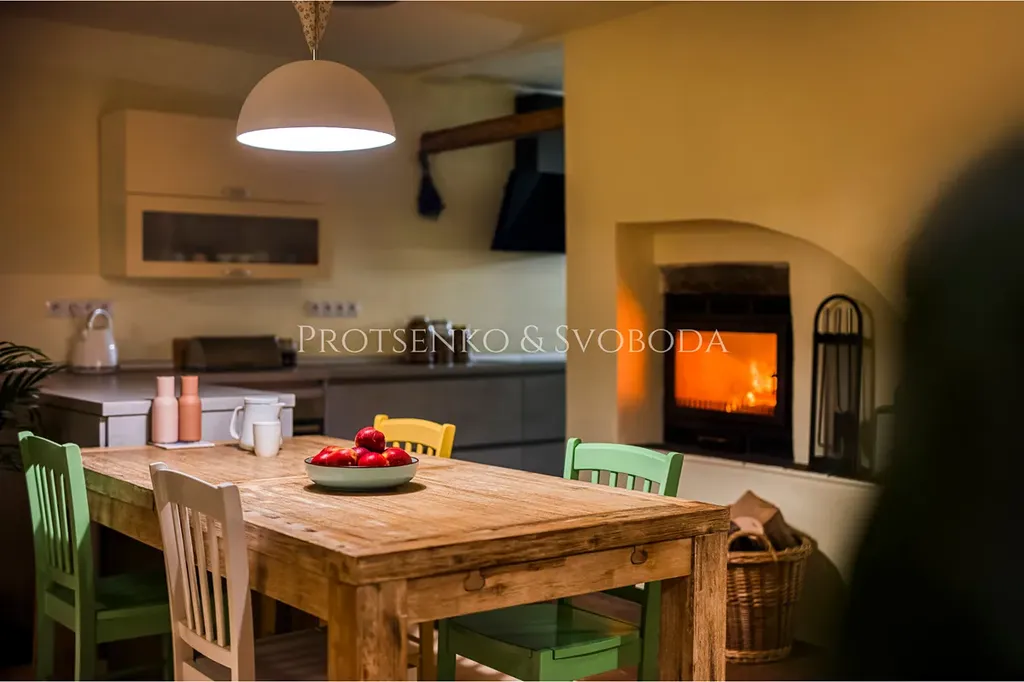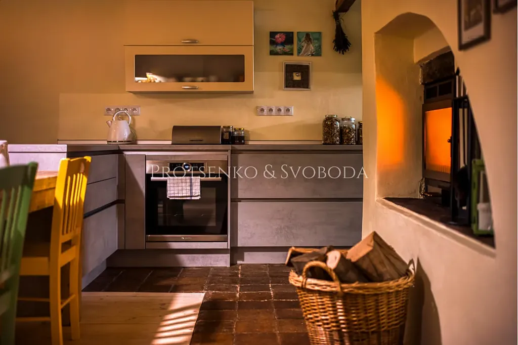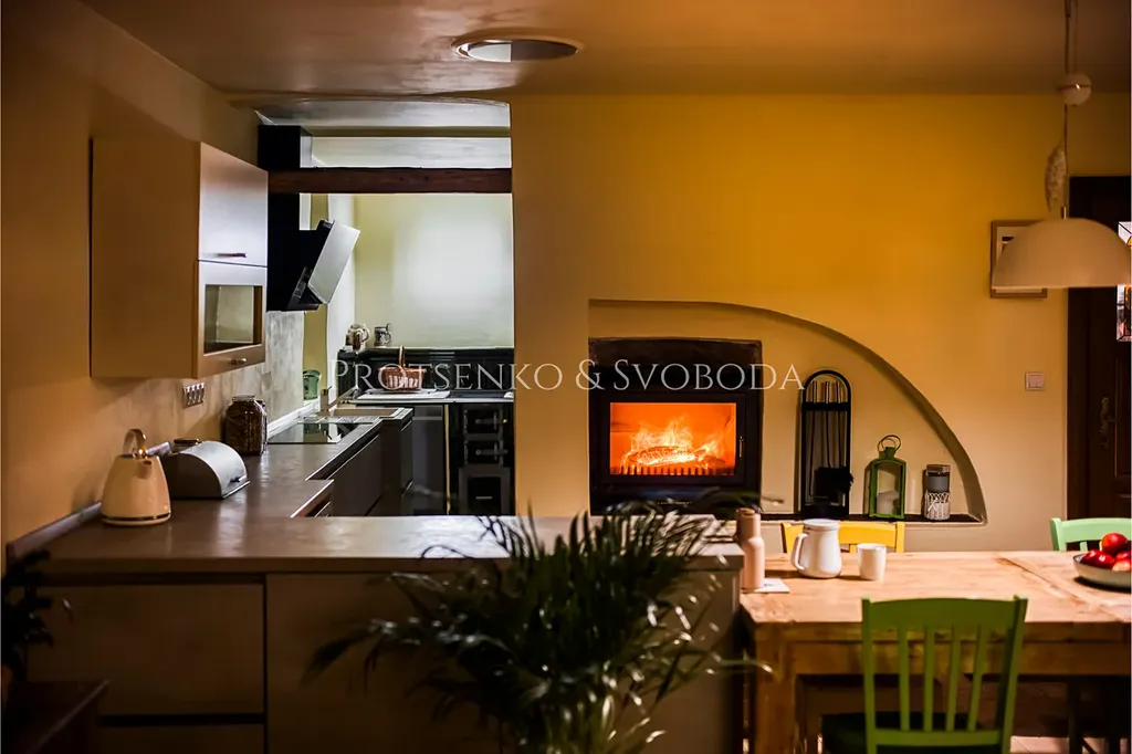 Hlavní obytná část vás přivítá prostorným obývacím pokojem propojeným s kuchyní, kde láhvově zelená kamna dodávají teplo a útulnou atmosféru.