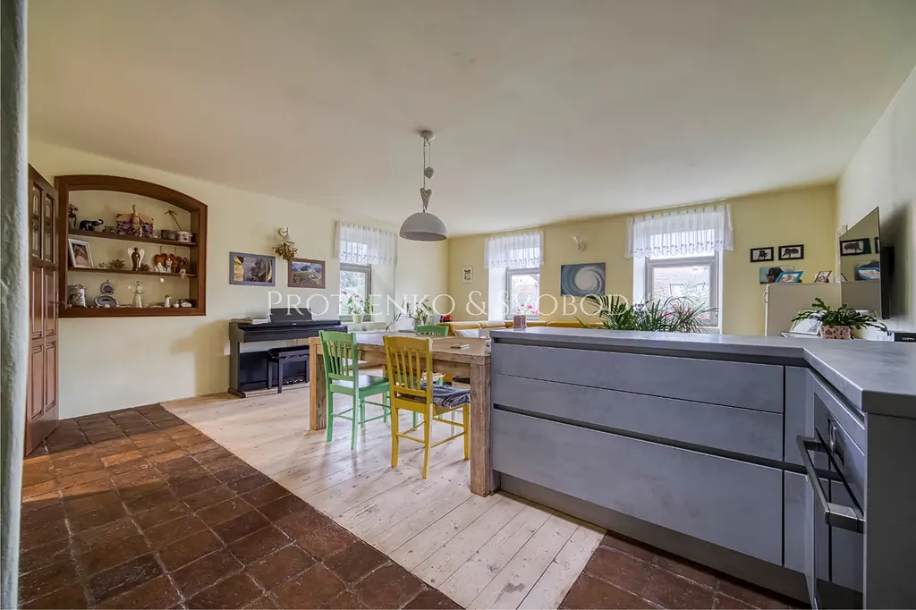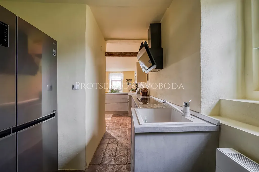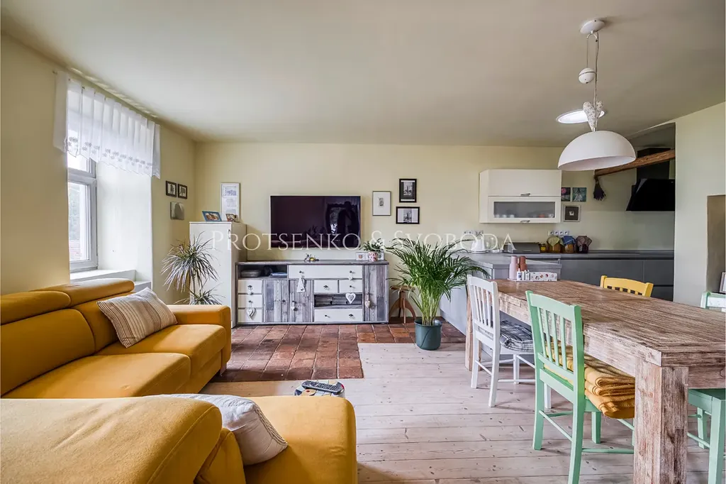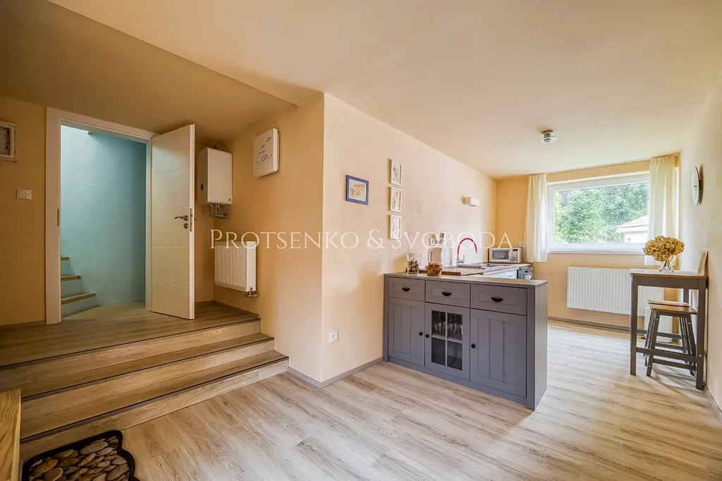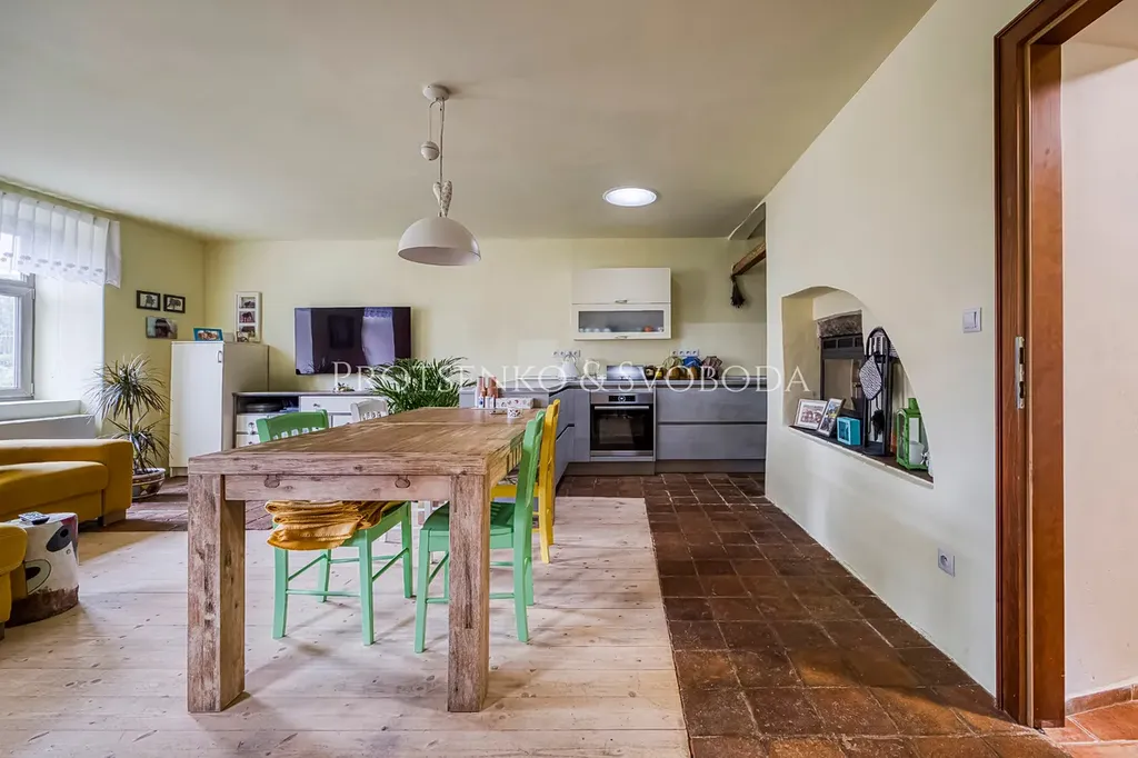 Hlavní obytná část vás přivítá prostorným obývacím pokojem propojeným s kuchyní, kde láhvově zelená kamna dodávají teplo a útulnou atmosféru.