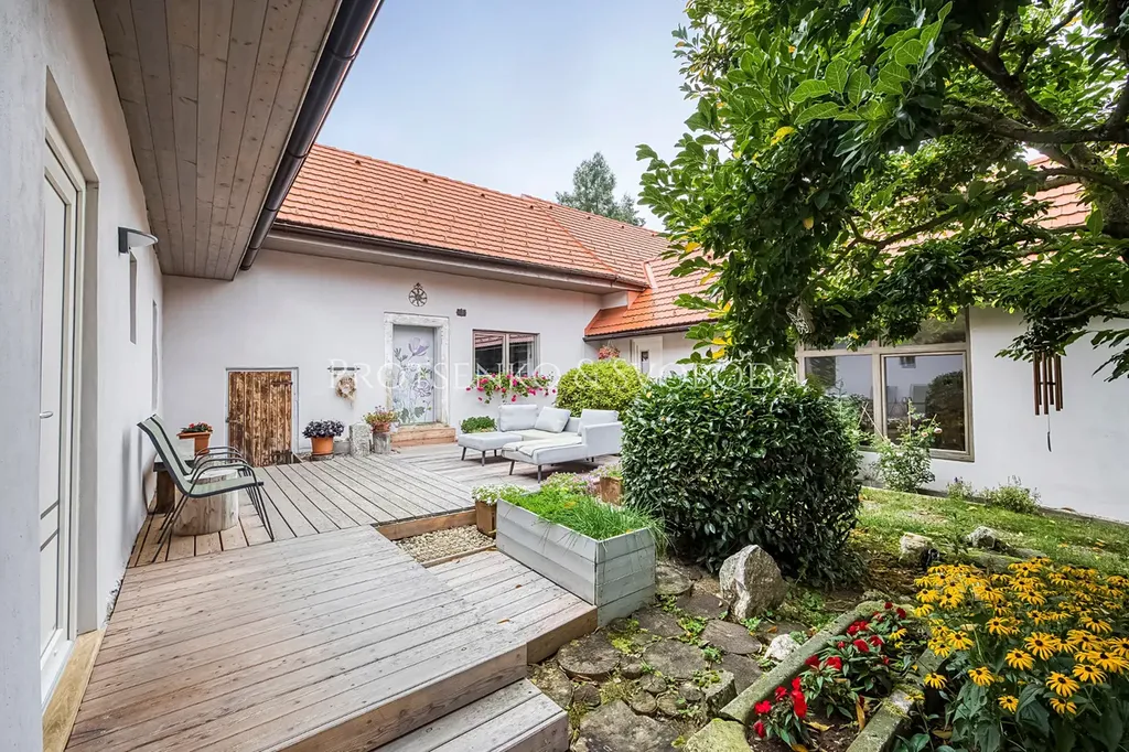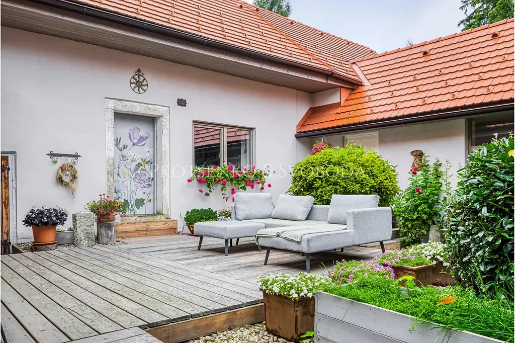 Jednou z největších přidaných hodnot této nemovitosti je rozlehlá a pečlivě založená zahrada, která vznikala více než půl století s citem a láskou místního umělce. Do prostoru vtiskl svůj osobitý rukopis a dodnes tu zůstaly jeho stopy – jemné detaily ukryté mezi stromy, v trávě i u jezírka a výsledkem je jedinečné dílo přírody i lidské tvořivosti.