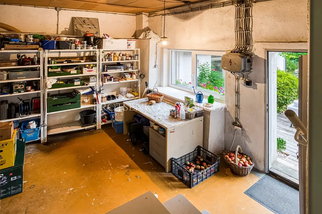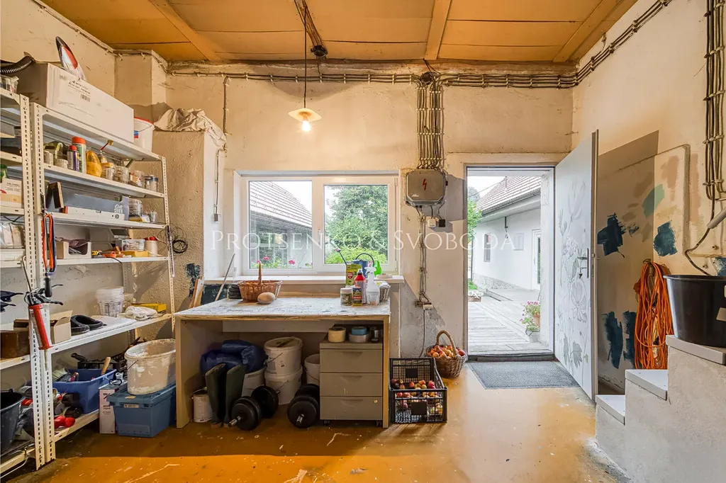 Obě obytné části propojuje prostorná dílna s vysokým stropem, která nabízí široké možnosti využití. Je to místo, kde najde své zázemí každý kutil i kreativec – může sloužit jako ateliér, řemeslná dílna či prostor pro skladování. Díky své velikosti a dispozici otevírá prostor pro další nápady a přetvoření podle potřeb nového majitele.