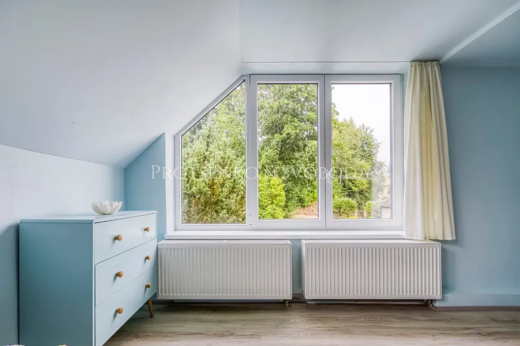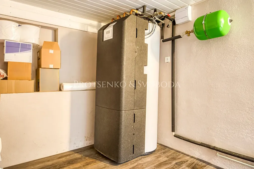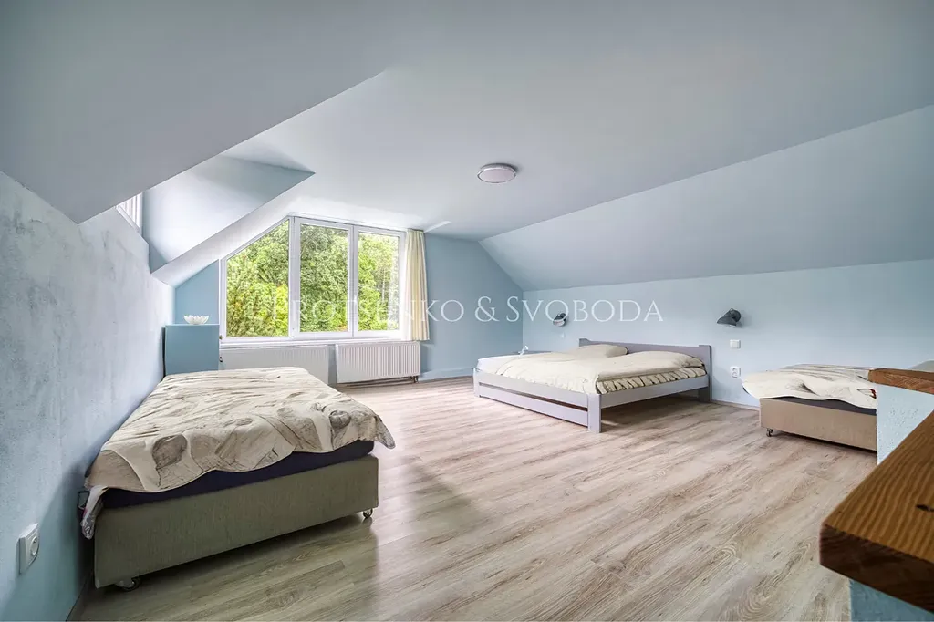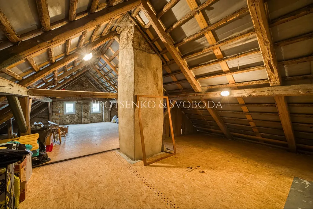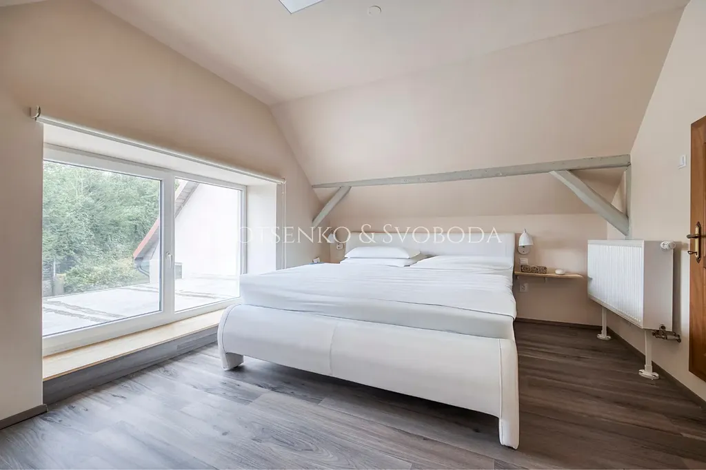 Ze vstupní chodby je přístup do technické místnosti a šatny, odkud se vchází do koupelny a zárověn tu pak vede dřevěné schodiště do ložnice s přístupem na půdu o rozloze 66 m² – místo s obrovským potenciálem k vytvoření další obytné části.