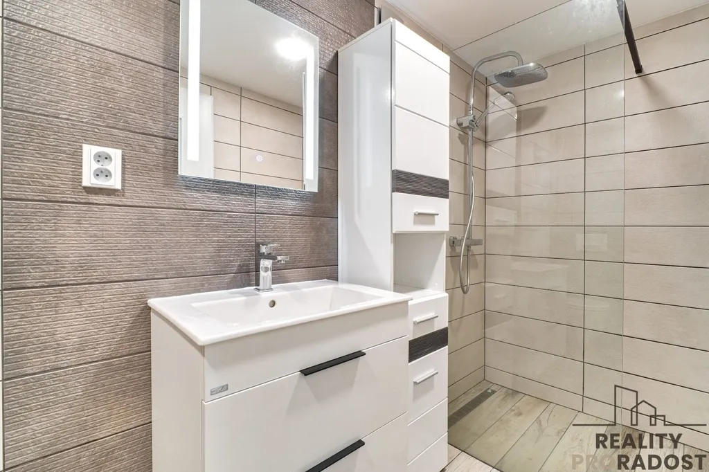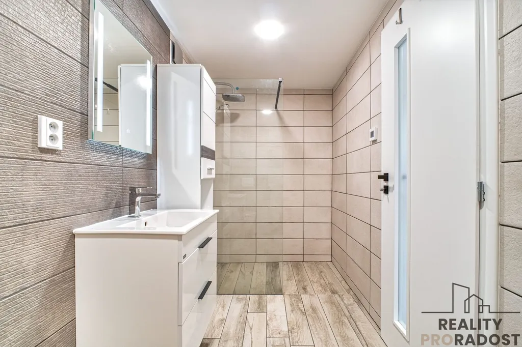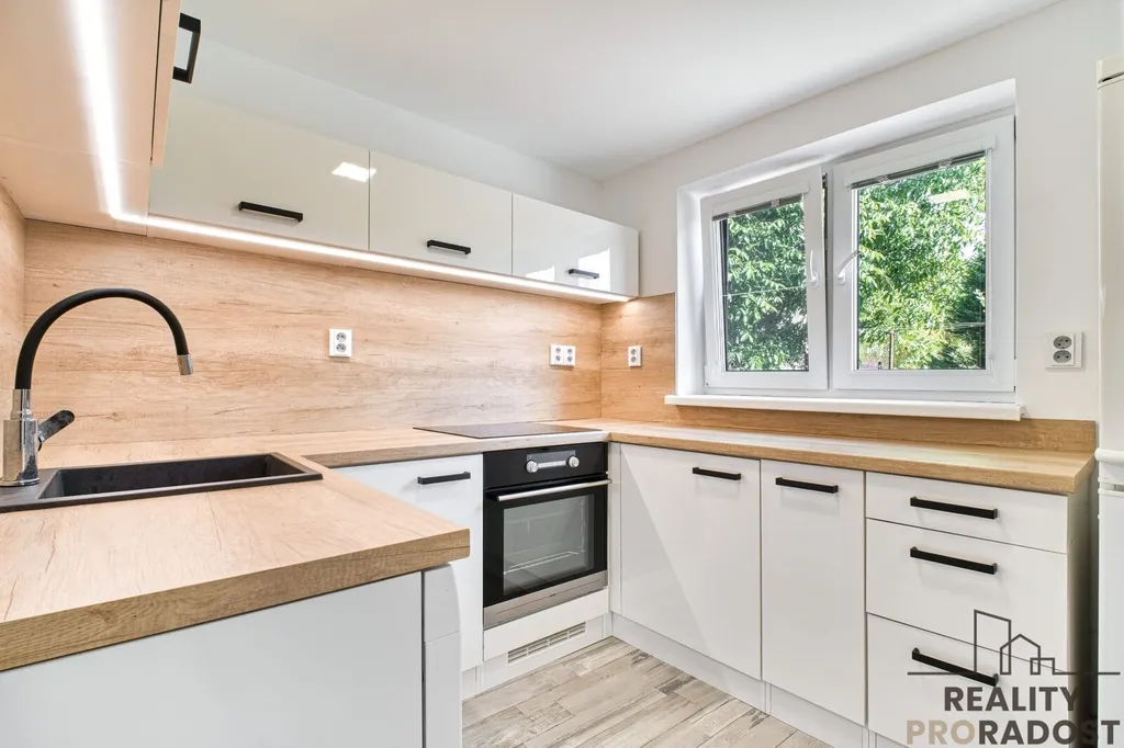 Kuchyně do tvaru U kombinuje dekor lesklé bílé a dřevodekoru. Nachází se zde indukční varná deska, elektrická trouba, granitový dřez v černé barvě s baterií, LED osvětlení horních skříněk. V koupelně se nachází walk-in sprchový kout, umyvadlová skříňka, úložné prostory, toaleta a příprava na pračku. Z obývacího pokoje je výstup na terasu, která je orientovaná do zahrady.