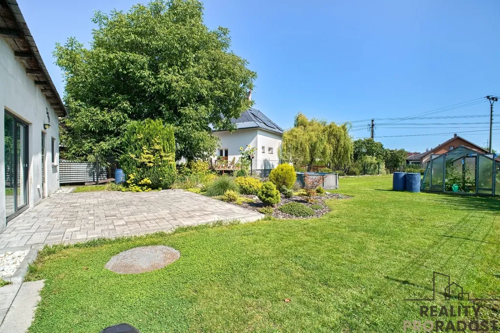 Vzrostlá zahrada je pravidelně udržována, nachází skleník a příprava na bezdrátovou robotickou sekačku Husqarna. Celý pozemek je nově oplocen pletivovým plotem.
