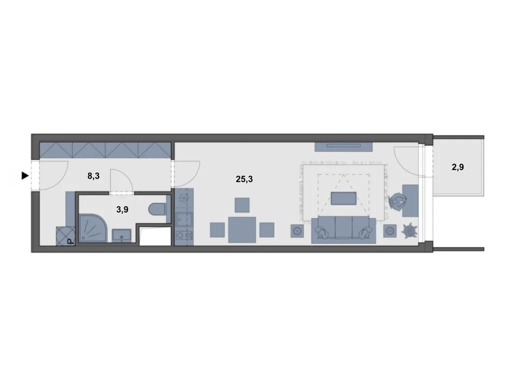 • Obývací pokoj s kuchyňskou linkou 25,3 m², vstup na balkon 3 m² (pokoj cca 7,63 × 3,25 m)