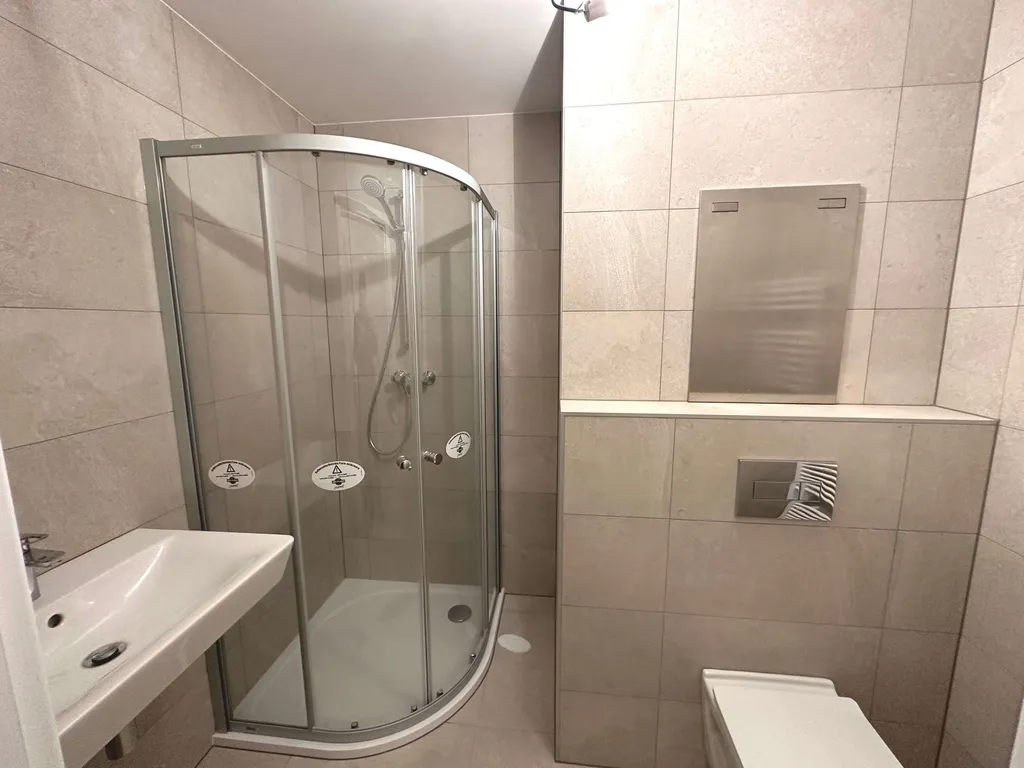 • Koupelna 3,9 m² se sprchou a WC, otopný žebřík