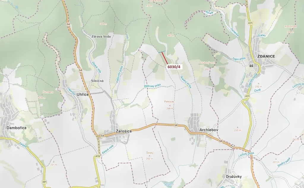 Lesní pozemek o výměře 2108 m2, parcelní číslo 6030/4, podíl 1/1, katastrální území Archlebov, obec Archlebov, obec s rozšířenou působností Kyjov, okres Hodonín, Jihomoravský kraj. Po těžbě.