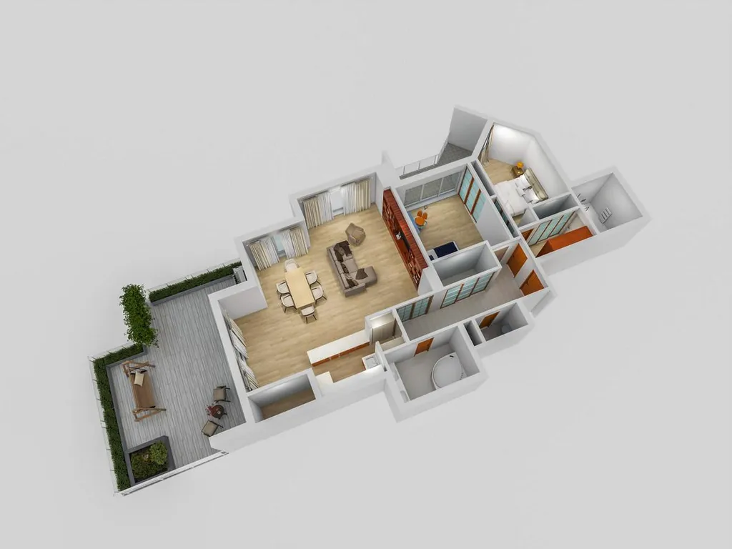 Byt je velmi prostorný a světlý. Při vstupu Vás jistě zaujme prostorná hala, ze které je samostatný přístup do všech místností v bytě. Rozlehlý obývací pokoj s kuchyní má celkem 49 m2, naleznete v něm dostatek prostoru pro příjemné rodinné stolování či posezení s přáteli. Z obývacího pokoje je přístup na jihozápadně orientovanou terasu 38 m2. Tento prostor vám rozšíří vaše pohodlí a komfort v teplejším období, jistě zde najdou svůj kout nejen milovníci sluníčka, ale můžete terasu využít také k relaxaci po náročném dni nebo grilování.