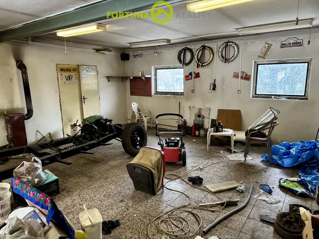 Vedle domu je další stavba s dvojgaráží a dílnou o velkosti 48 m2. Do garáže je přivedena elektřina 230/400 V, plynová přípojka a je vybavena kamny na topení. Tato garáž je vhodná i pro drobné automechaniky a kutily.