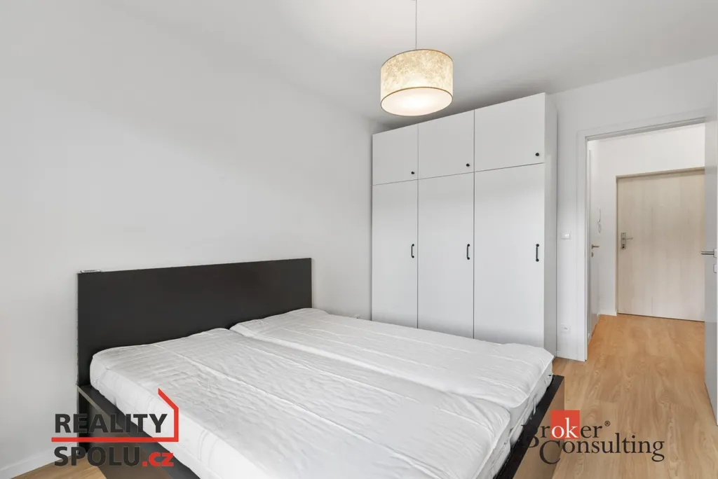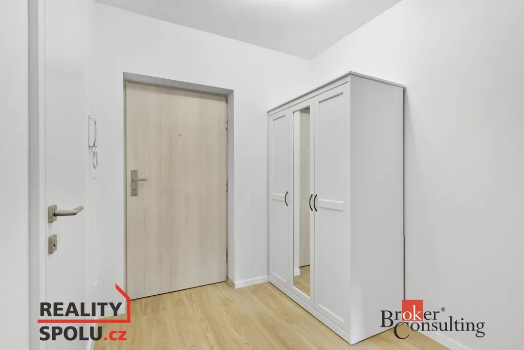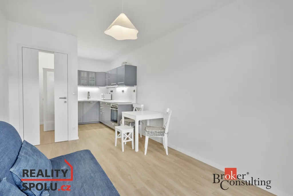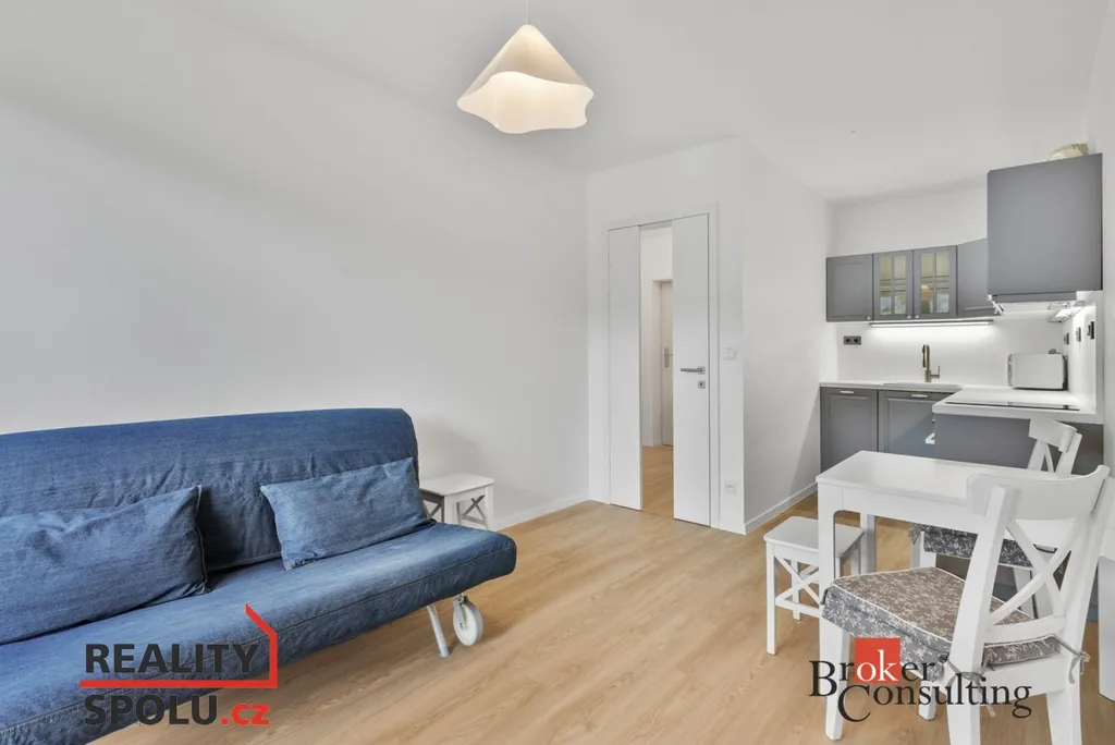 Byt se pronajímá částečně zařízený – k dispozici je kuchyňská linka se spotřebiči, jídelní stůl se židlemi, pohovka a postel.