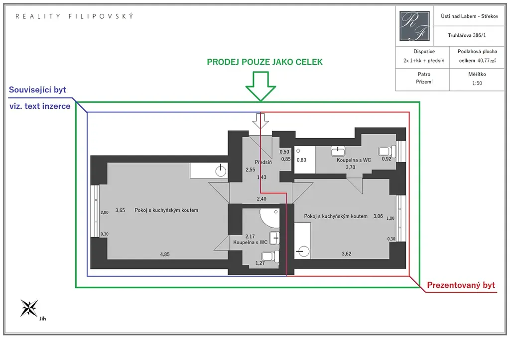 Legislativně se jedná o jednu bytovou jednotku, kdy každá z nich má vlastní koupelnu a kuchyňský kout. Společně pak mohou uživatelé jednotek využívat předsíň, ve které se nachází prostor a přípojka na automatickou pračku. Je to zcela ideální dispoziční řešení pro každého investora s plánem následného pronájmu s výborným poměrem výkon cena.