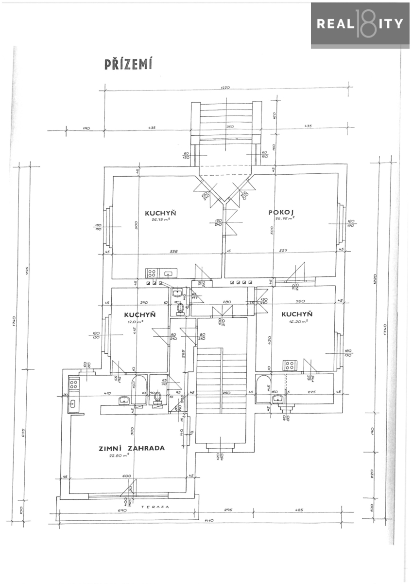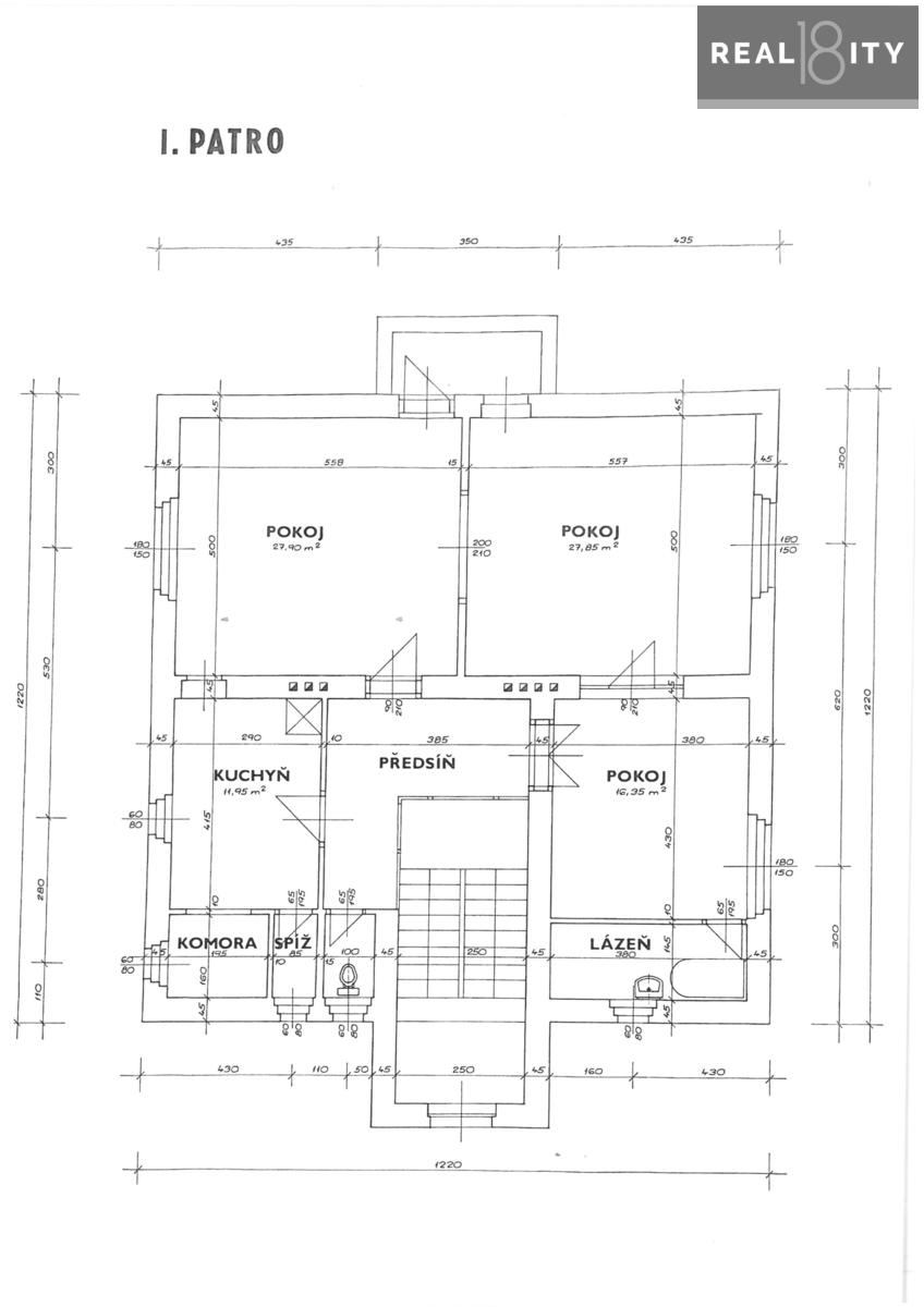 V 1. patře se nachází kuchyň, komora, 3 pokoje, zimní zahrada, koupelna, samostatná toaleta.