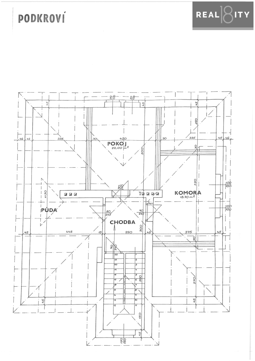 V podkroví jsou dva pokoje, koupelna s vanou, toaletou, vstup na půdu, kde lze vybudovat další obytný prostor.