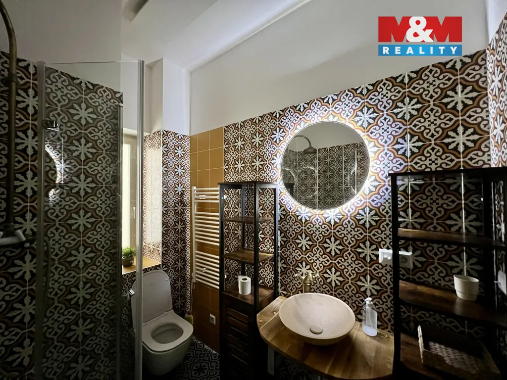 Ložnice poskytuje dostatek klidu a soukromí. Koupelna je vybavena sprchovým koutem, toaletou a pračkou, zaujme originálním designem s výraznými obklady. Byt působí vzdušně, má vyšší stropy a osobitý charakter.