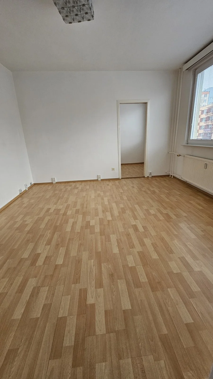 Přes obývací pokoj vstup do ložnice a do kuchyně. Na podlaze plovoucí podlaha.