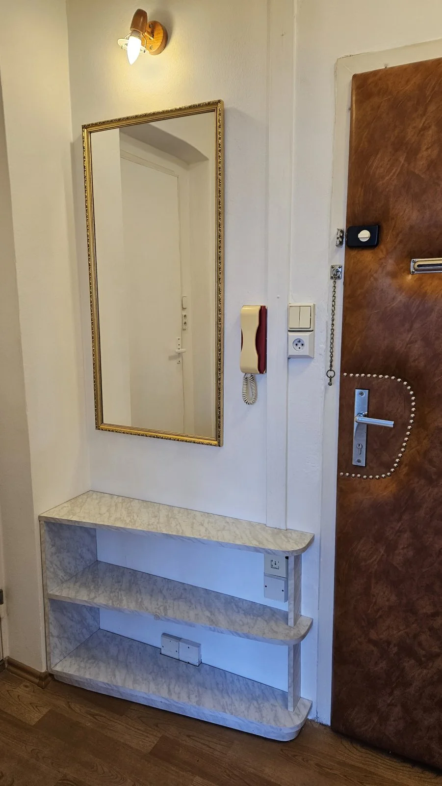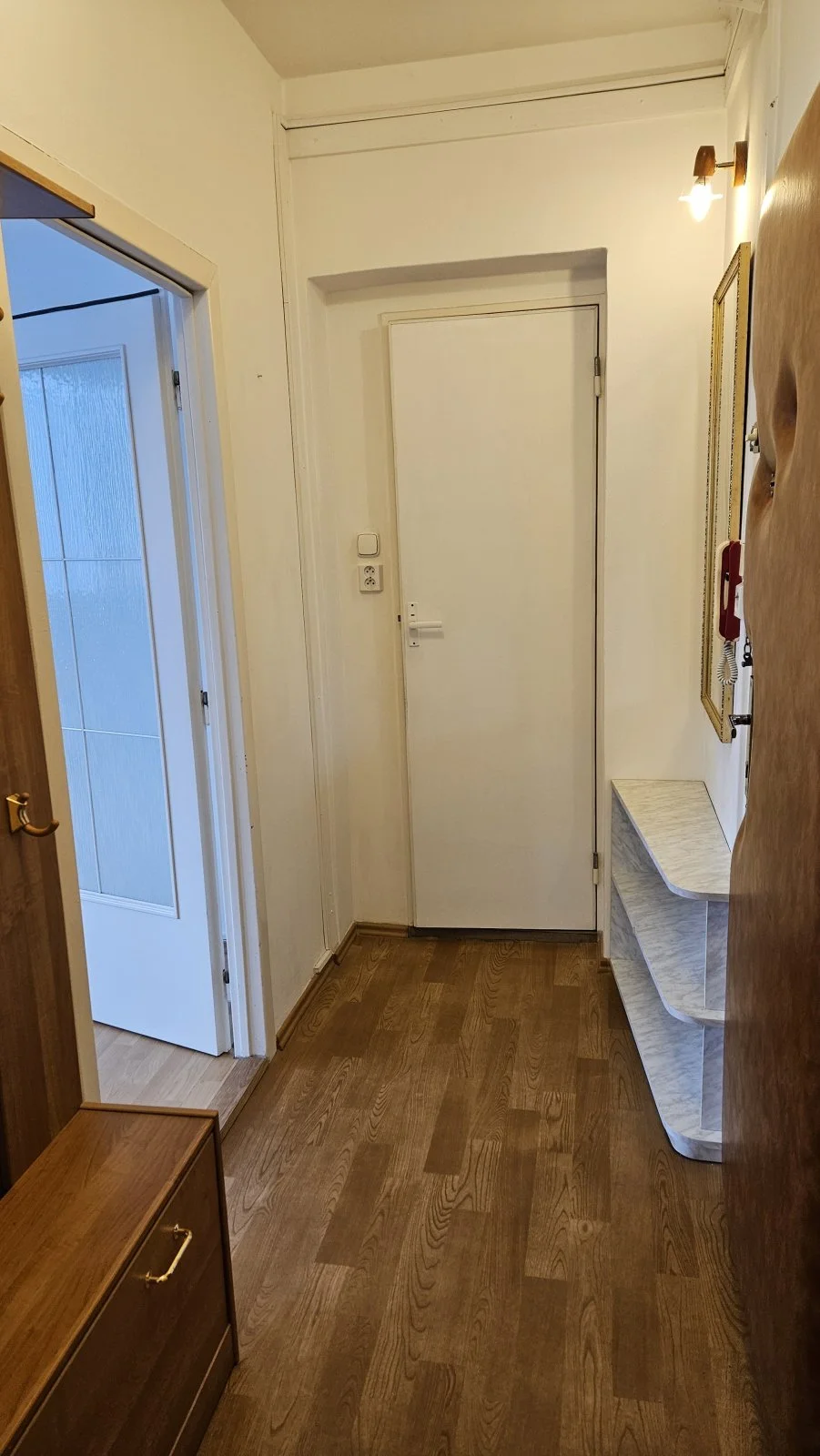 Z předsíně vstup do koupelny a obývacího pokoje. V předsíní vestavěná skříň i odkládací stěna, zrcadlo s vestavěnou policí.