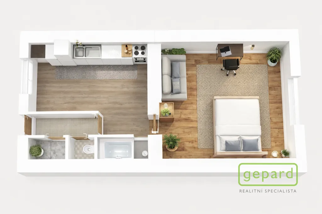 Podlahy: pokoj – dřevěná podlaha, kuchyně – plovoucí podlaha, koupelna a WC – dlažba. Byt je situován jako předposlední na pavlači, což zajišťuje vyšší míru soukromí.