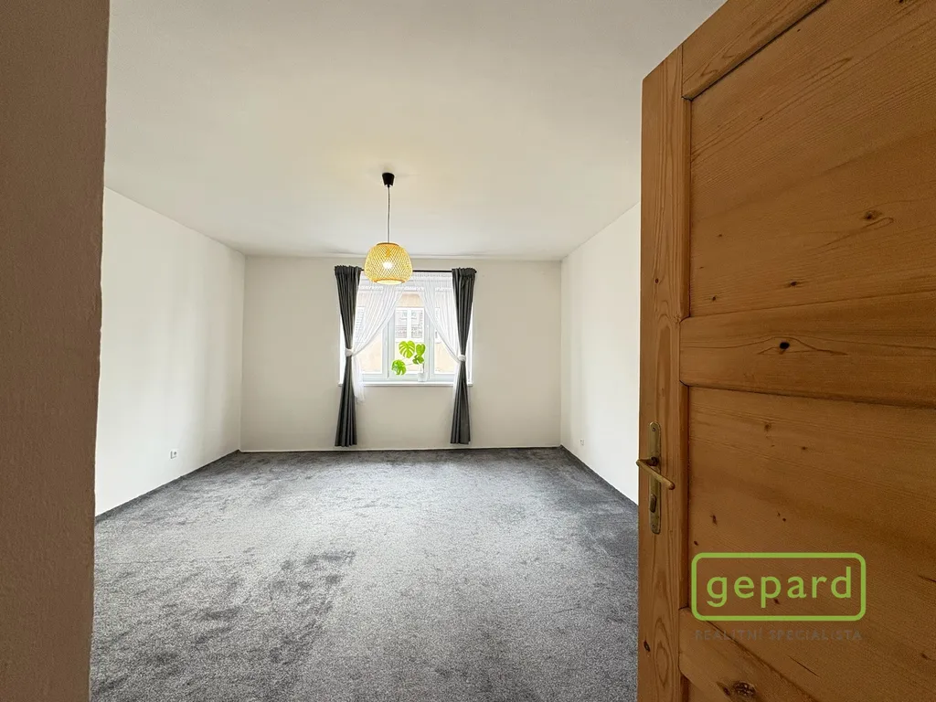 Dispozice bytu zahrnuje vstupní chodbu, samostatné WC, koupelnu s vanou, komoru, prostornou kuchyni, ve které je dostatek místa i pro jídelní kout nebo pracovní místo, a samostatný pokoj o výměře přes 20 m². K bytu náleží nadstandardní sklep o výměře více než 4 m².
