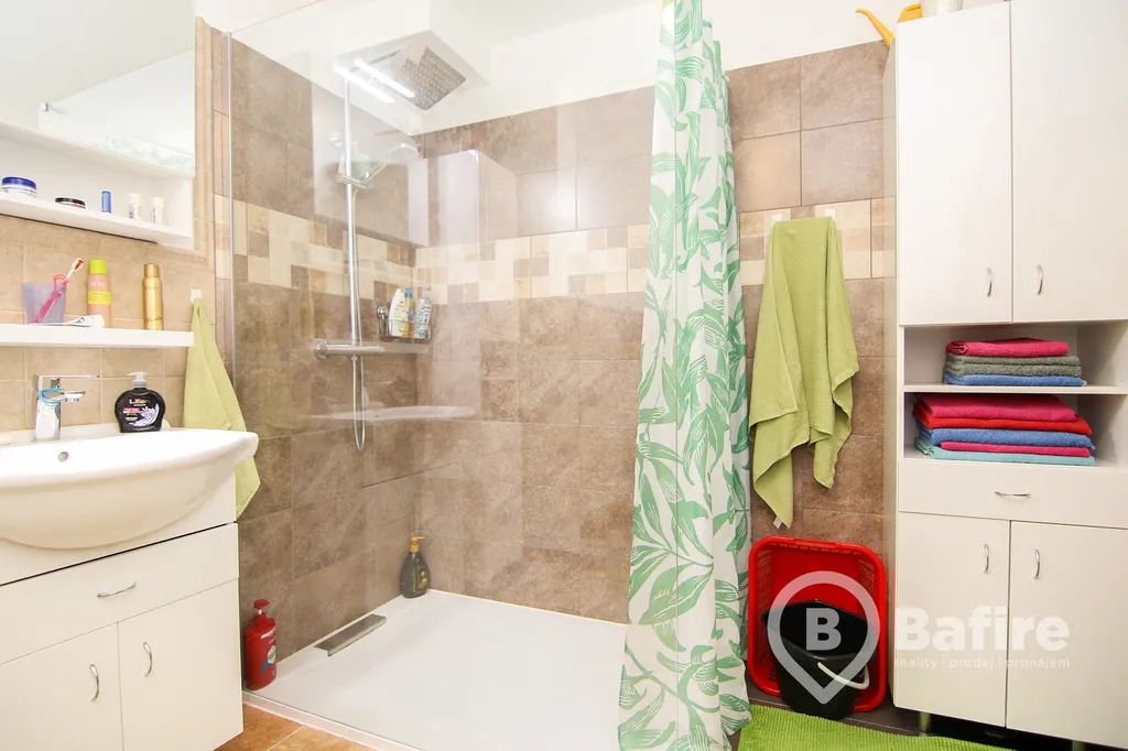 Koupelna poté disponuje nadstandardním sprchovým koutem a velkým množstvím úložného prostoru.