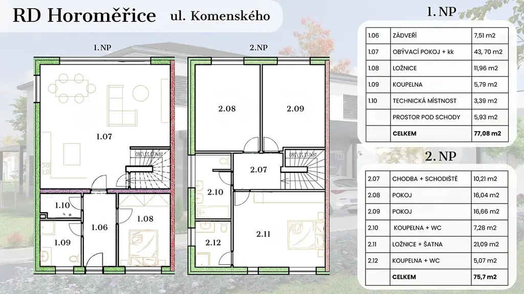 V horním patře budou dva pokoje vedle sebe, prostorná koupelna s vanou a sprchovým koutem. Další místností v horním patře je ložnice, která je spojená s prostornou šatnou a pracovním koutem / soukromou koupelnou.