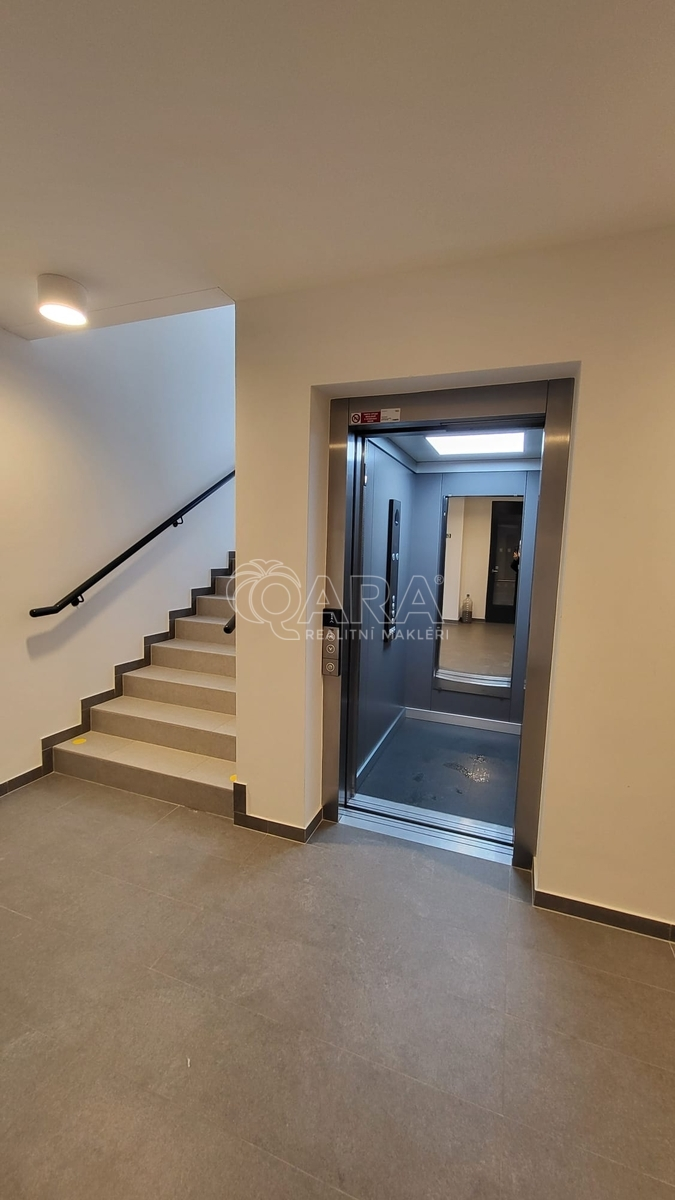Byt také nabízí komfort v podobě jednoho garážového stání, které je zahrnuto v ceně pronájmu, zatímco druhé garážové stání je k dispozici za 2200,- Kč/měsíc. Dům je vybaven výtahem, což přispívá k pohodlnému bydlení.