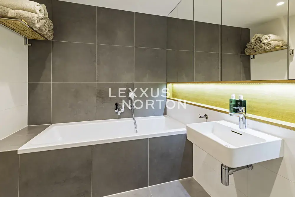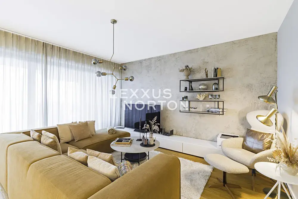 Byt nabízí plně vybavený kuchyňský kout spotřebiči značky Miele (sklokeramická deska, trouba, lednice, mrazák, myčka nádobí) obývací pokoj s luxusním nábytkem BoConcept a Poliform. Vstupní chodbu s vestavěnými skříněmi, dále koupelnu se sanitou Laufe (vana, sprchový kout, toaleta). K dispozici je také pračka a sušička.