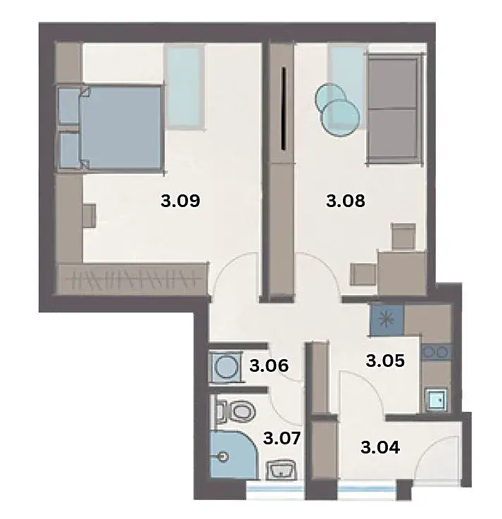 obytná místnost 15,8 m2, obytná místnost 13,65 m2, kuchyně 5,2 m2, koupelna se sprchovým koutem a WC 3,6 m2, chodba 2 m2, zádveří 2,75 m2.