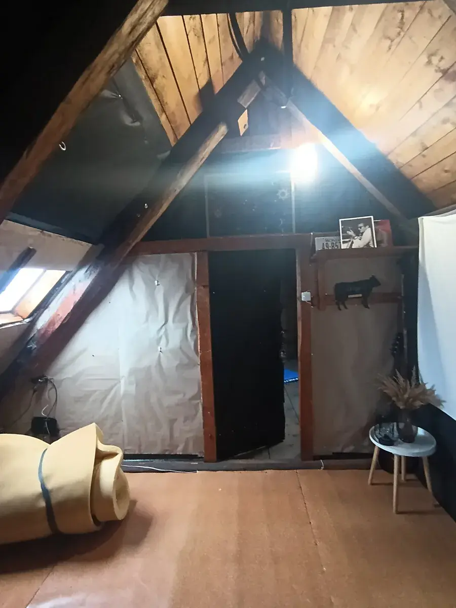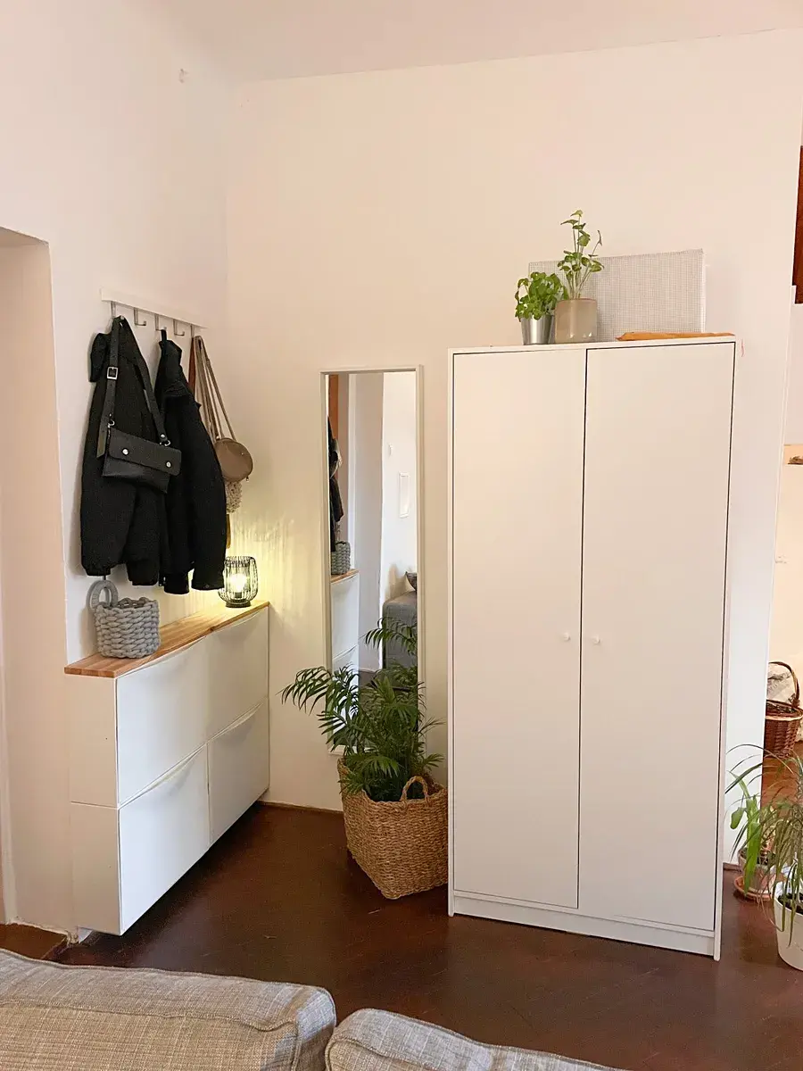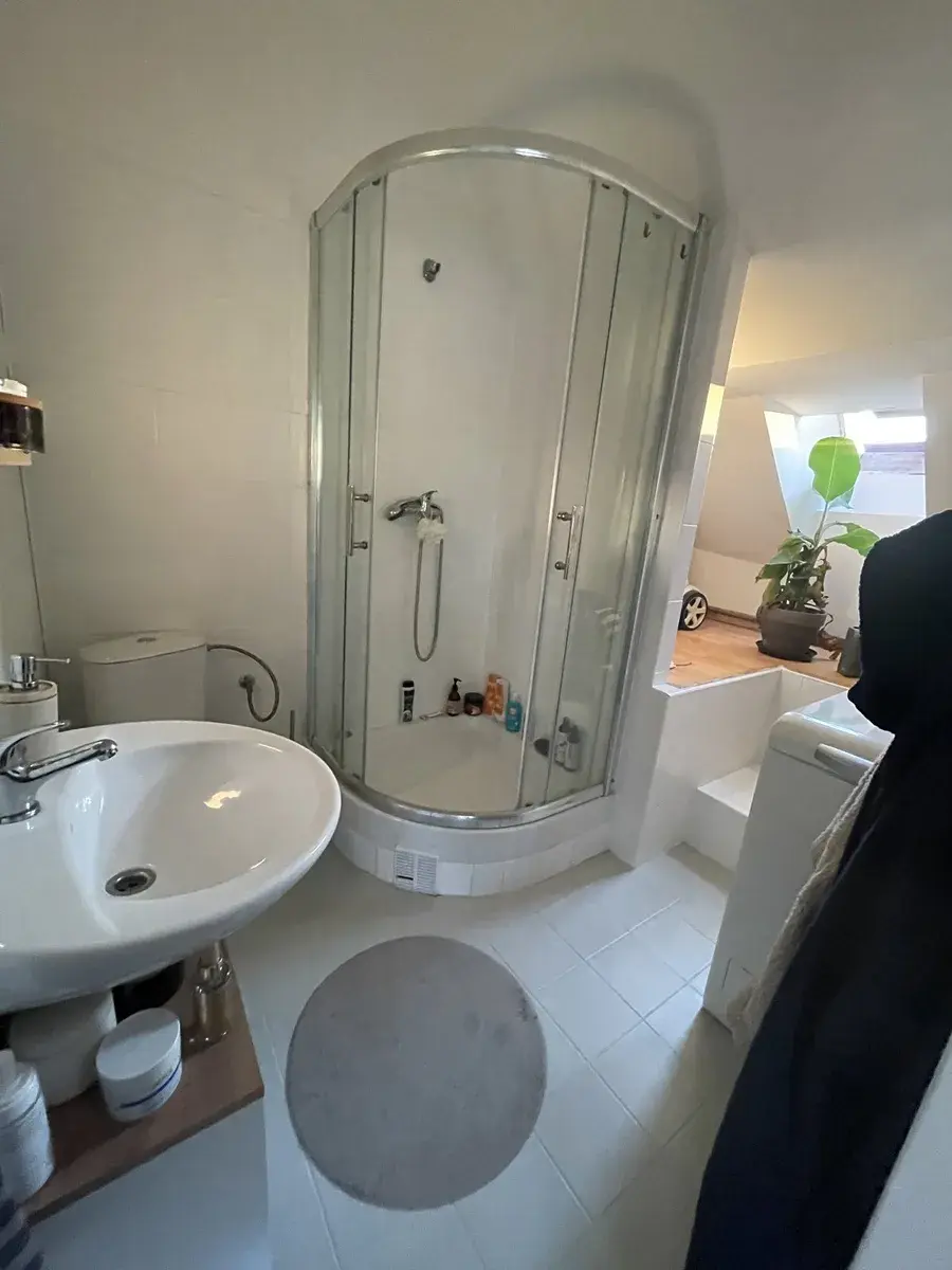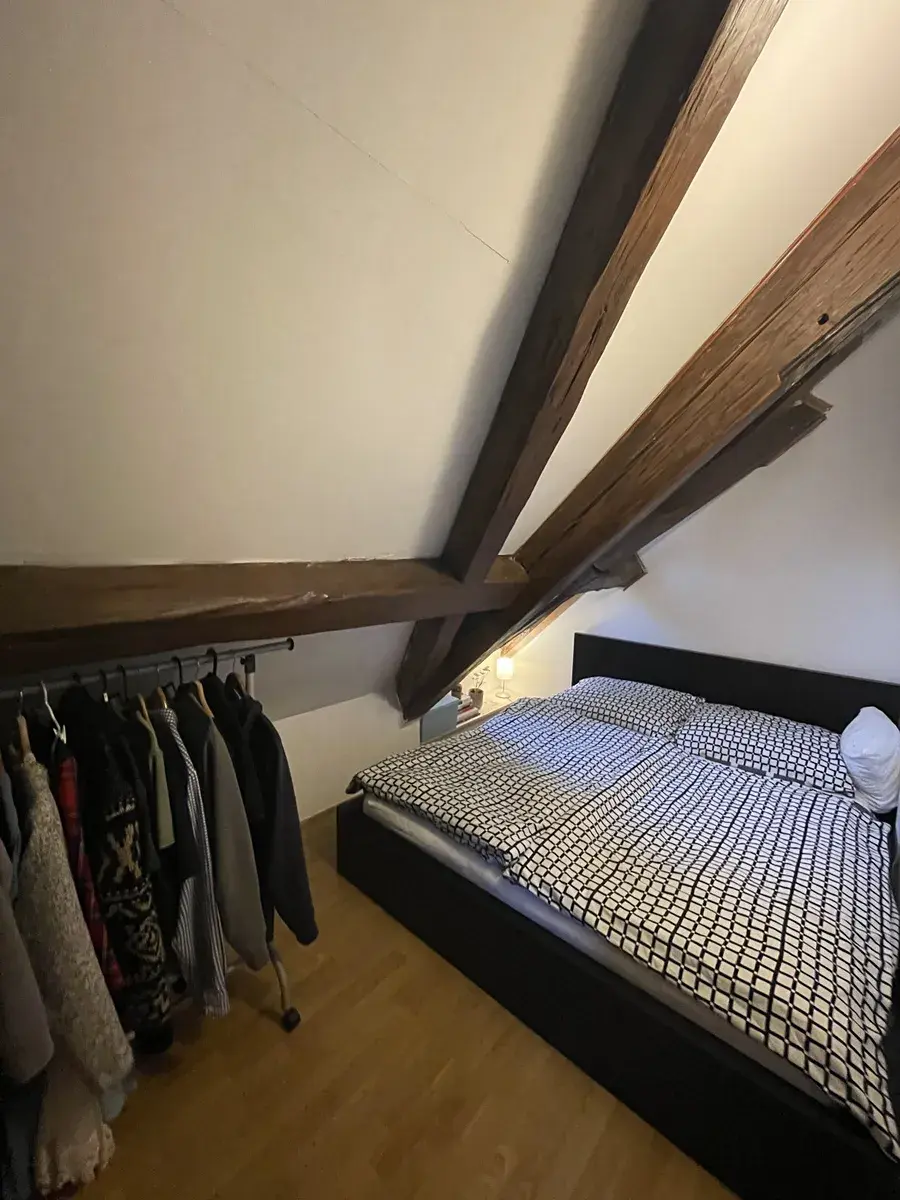 Z chodby (společná pro dva byty), kterou lze využít jako předsíň, se vchází do hlavní místnosti. Ta se člení na obývací část a kuchyňský sektor. Kuchyňský sektor je oddělen od obytné části jídelním stolem a židlemi. Vstup do koupelny se nachází na rozmezí kuchyně a obývací části. Koupelna s oknem je vybavena sprchovým koutem, WC a automatickou pračkou. Na protilehlé straně bytu je situován vstup do malé podkrovní ložnice s přiznanými trámy – viz foto. Nad bytem je vlastní půdní pokoj, možnost jako ateliér či odkládací prostor.