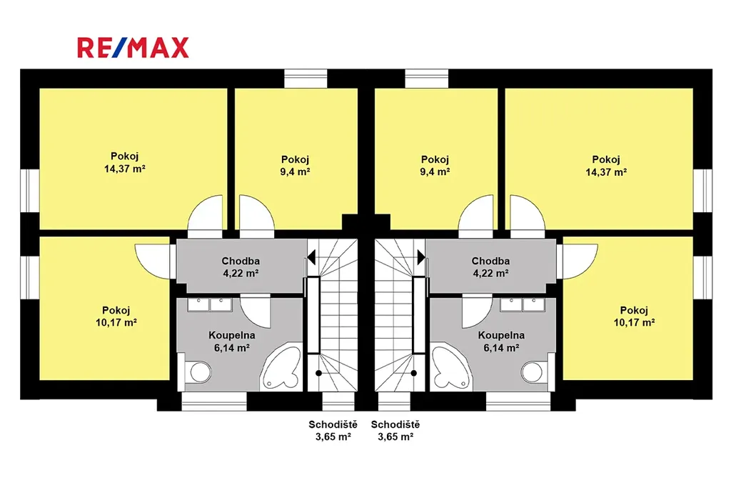 V patře jsou tři samostatné pokoje a koupelna s vanou a WC.