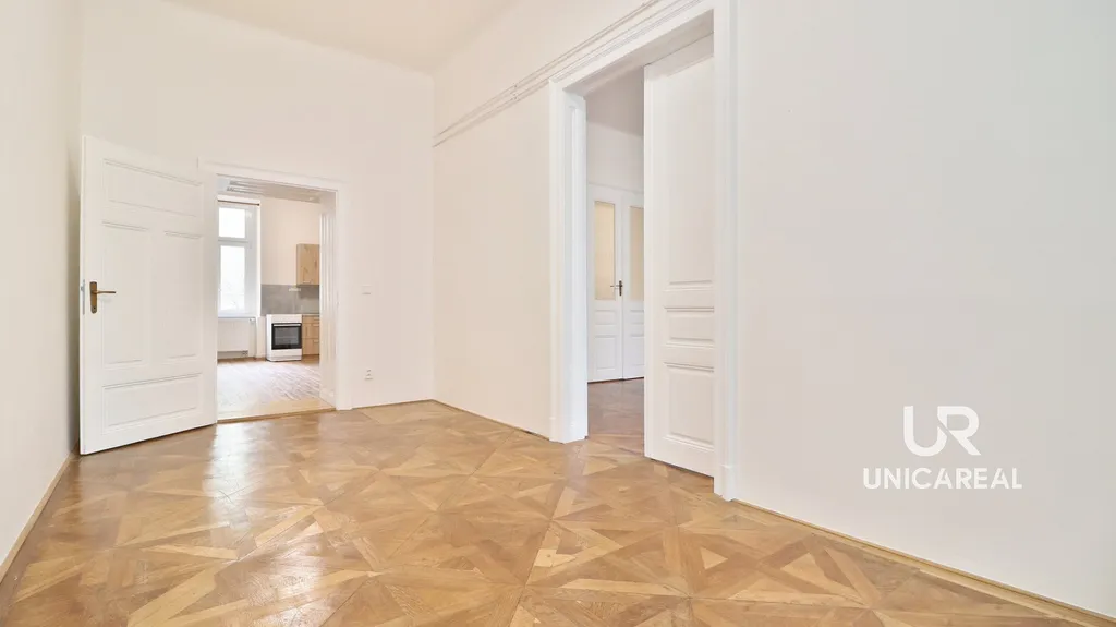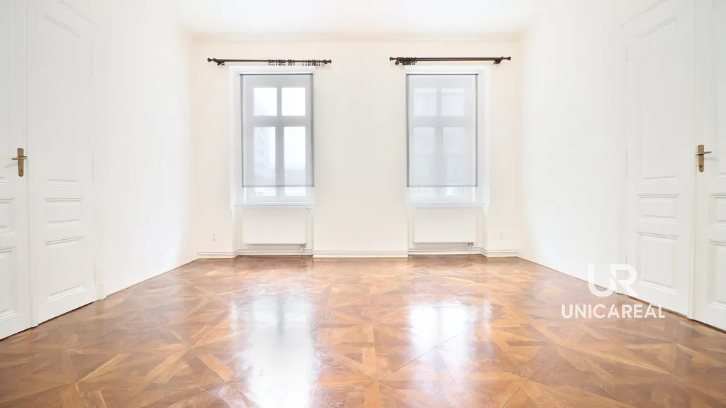 Stylový byt s vysokými stropy a dvoukřídlými dveřmi je situovaný v 1 N. P. a má celkovou užitnou plochu 130m². Nabízí se nezařízený. Je zde pouze kuchyňská linka, el. varná deska, el. trouba příslušenství koupelny a WC. V bytě jsou 2 koupelny s WC a 2 předsíně. Vzhledem ke specifické dispozice, mohou být všechny 3 pokoje neprůchozí, tudíž vhodné např. pro 3 páry. Velikost bytu a dispozice také umožňují zkombinovat bydlení s kanceláří.
