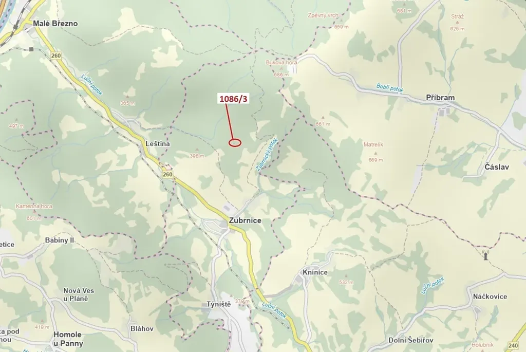 Lesní pozemek o výměře 18 m2, parcelní číslo 1086/3, podíl  9/10, katastrální území Zubrnice, obec Zubrnice, obec s rozšířenou působností Ústí nad Labem, okres Ústí nad Labem, Ústecký kraj.