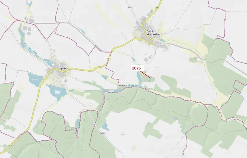 Lesní pozemek o výměře 1134 m2, parcelní číslo 1075, podíl 1/1, katastrální území Dolní Vilémovice, obec Dolní Vilémovice, obec s rozšířenou působností Třebíč, okres Třebíč, Kraj Vysočina. Po těžbě.