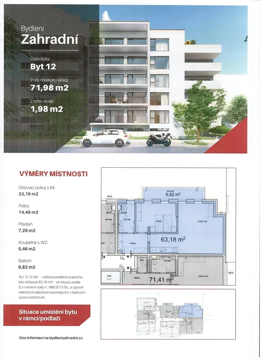Nabízíme Vám k prodeji nový byt o velikosti 2+kk+balkon s částečně stavebně odděleným prostorem pro spaní v obývacím pokoji, označený jako byt 12, nacházející se ve 2. NP o celkové ploše včetně balkonu a zděného sklepa 71,98 m2, který bude stavěn v rámci projektu Bydlení Zahradní v žádané plzeňské čtvrti Slovany na rohu Zahradní a Hradišťské ulice v docházkové vzdálenosti od kompletní občanské vybavenosti a zeleně.