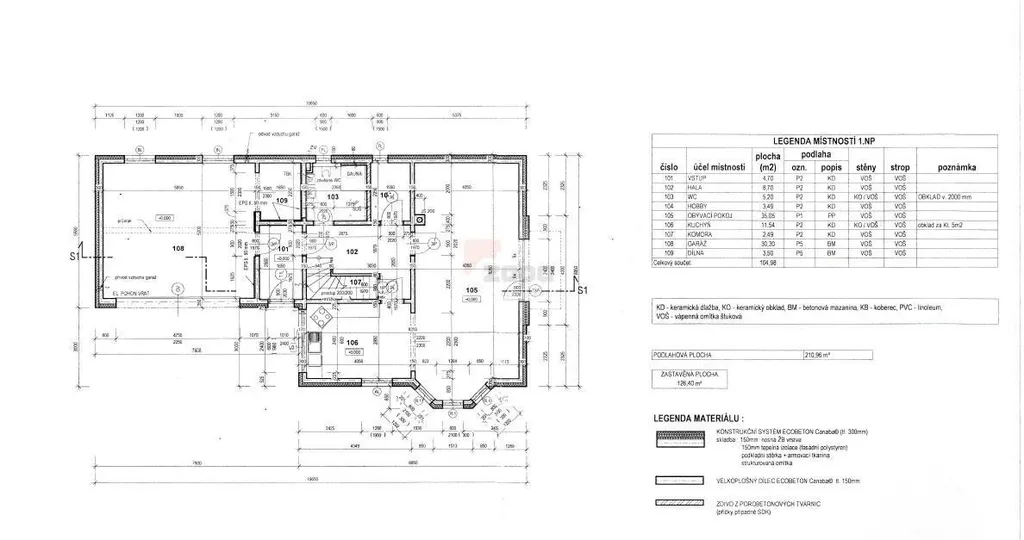 -Přízemí (104 m): Obývací pokoj s kuchyňským koutem (46,5 m) a přímým vstupem na terasu (53 m2) a zahradu. Koupelna s WC a saunou, šatna, úložný prostor, garáž s dílnou.