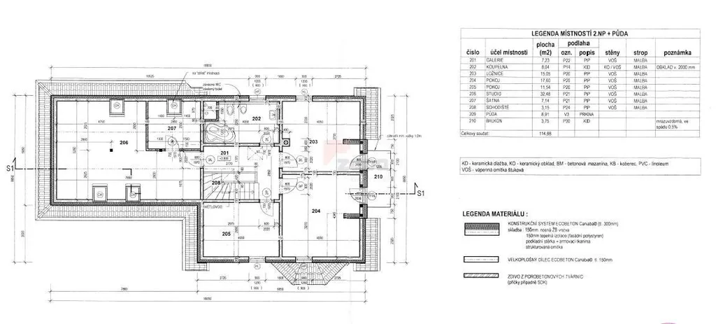 -1. patro (114 m): 4 ložnice, balkon, šatna, koupelna (vana), WC, přístup na půdu.