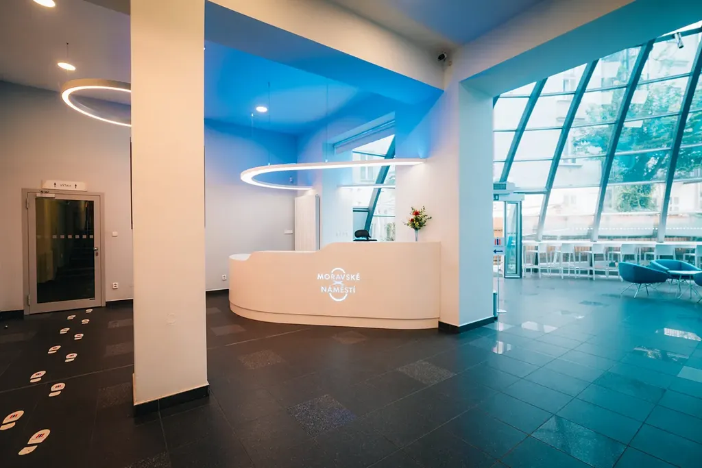 Kancelář lze spojit s vedlejší místností a vytvořit tak plochu 109m2 nebo až celkových 280,8 m2. Kanceláře nacházejí ve 5np. historické rohové budovy na Moravském náměstí 8. Celý objekt je využíván jako obchodní a kancelářské prostory pro různorodé spektrum nájemců.