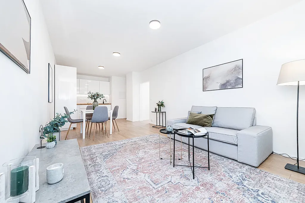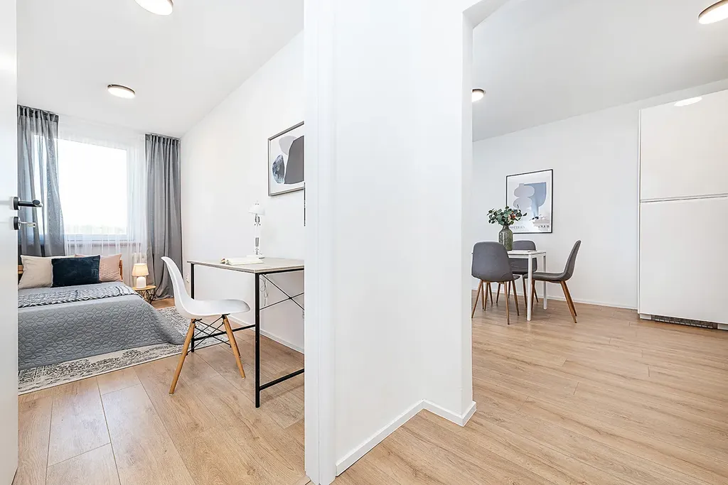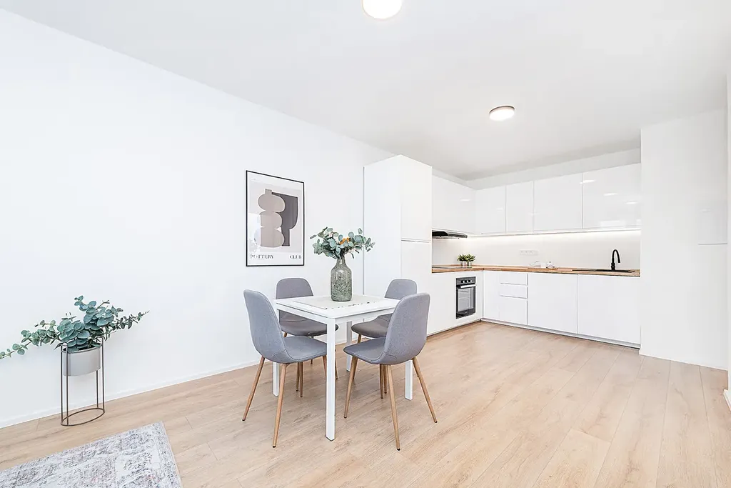Dispozici bytu tvoří dvě neprůchozí ložnice, velkorysý obývací pokoj spojený s kuchyní, prostorná koupelna se sprchovým koutem, samostatný záchod a uzamykatelná šatna/technická místnost.