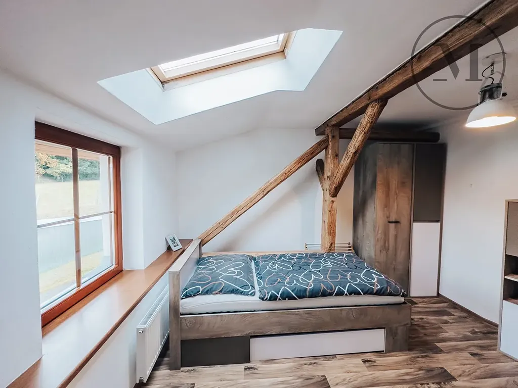 Dům má dvě nadzemní podlaží a vznikl citlivým spojením původní zděné chalupy s dřevěnou přístavbou. Je ve velmi dobrém technickém stavu po rekonstrukci a nabízí funkční řešení vhodné pro rodinné bydlení. Celek působí harmonicky a přirozeně zapadá do okolní krajiny.