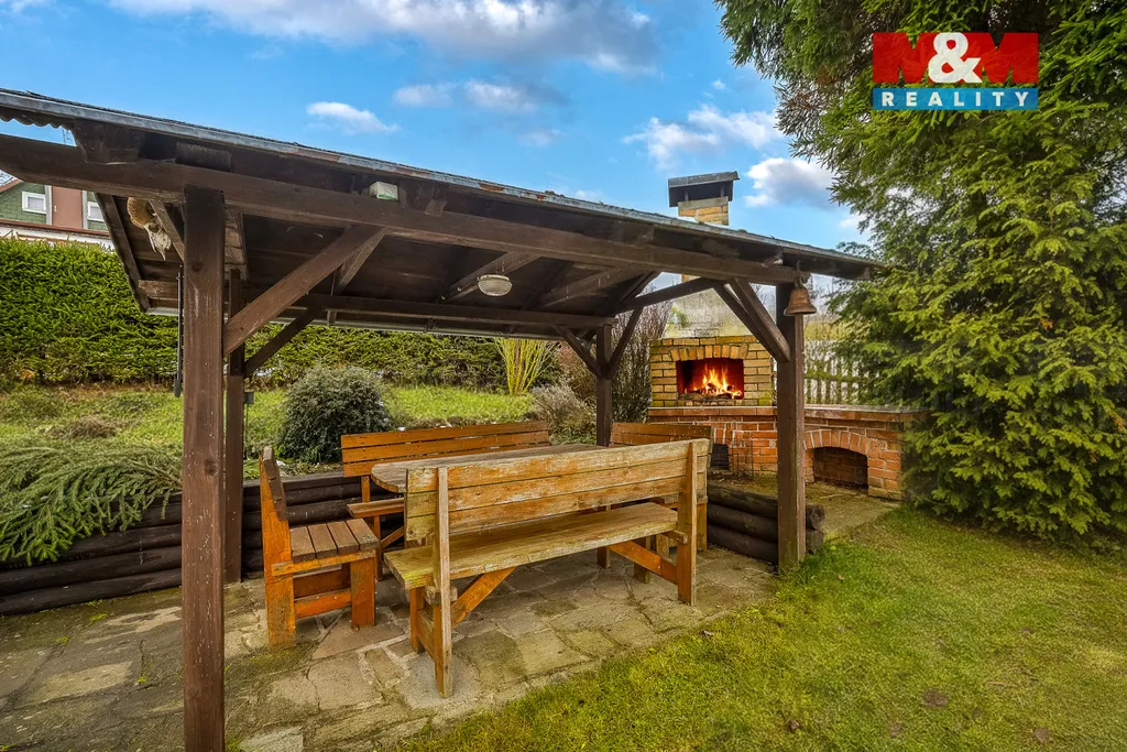 Na pozemku 358 m2 se nachází pergola s krbem a zahradní domek, který je ideální pro ukládání náčiní a zahradního nábytku.