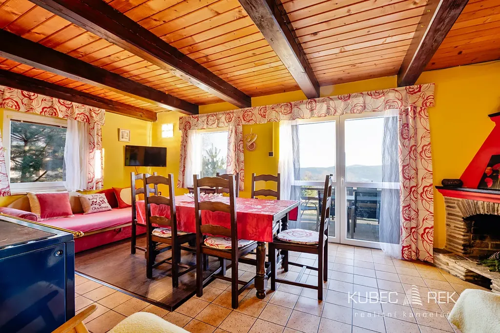 Interiér jedné z chat nabízí dispozici 4+1 o užitné ploše 89 m2 je rozložen ve třech podlažích. V přízemí se nachází předsíň a chodba s úložnými prostory, koupelna a útulná společenská místnost s krbem, která je propojená s kuchyní. Velké prosklené dveře propojují obývací část s terasou a nechají do prostoru pronikat dostatek světla i atmosféru lipenské krajiny. V prvním patře najdete dvě ložnice, zatímco celé podkroví tvoří další samostatný pokoj se střešními okny s výhledem na přehradu. Rekonstrukce z roku 2013 zahrnovala mimo jiné novou kuchyň, koupelnu, plovoucí podlahy, dřevěné obklady i nová střešní okna, takže chata působí velmi udržovaně a připraveně k okamžitému využití.