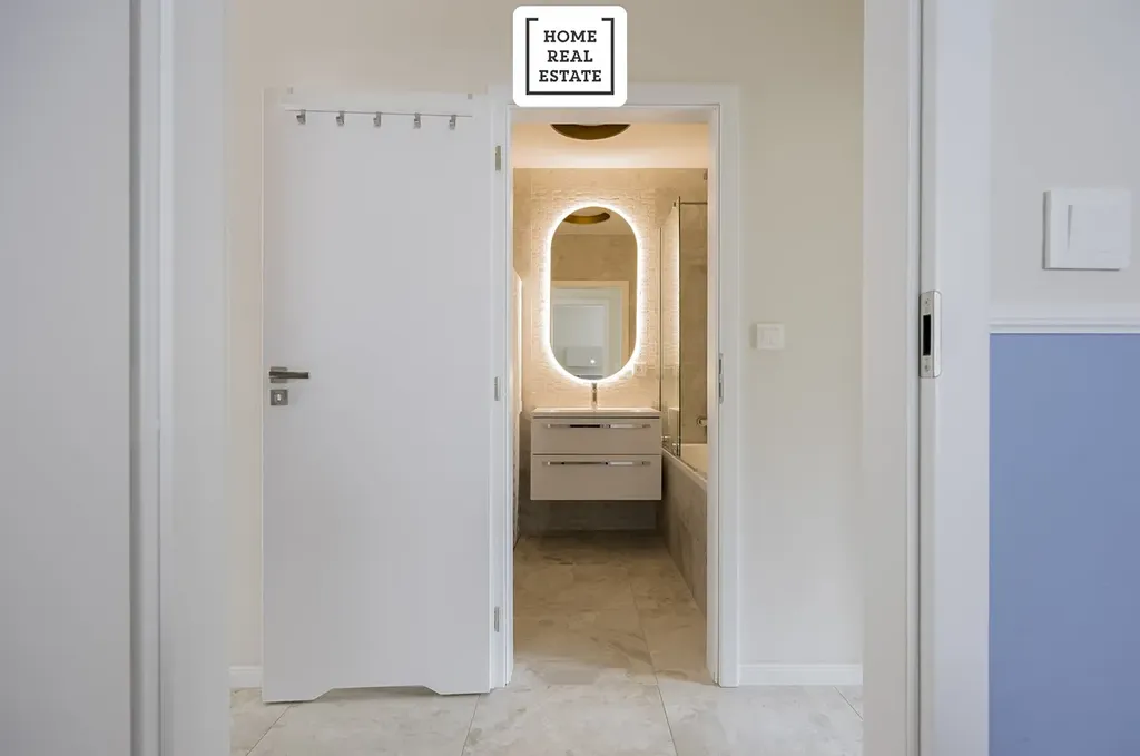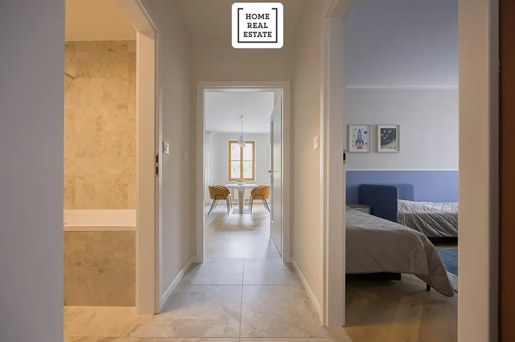 - koupelny, která nabízí krásnou vanu se sprchovým setem, umyvadlo se skříňkou, zrcadlo s LED osvětlením, další WC a pračku se sušičkou,