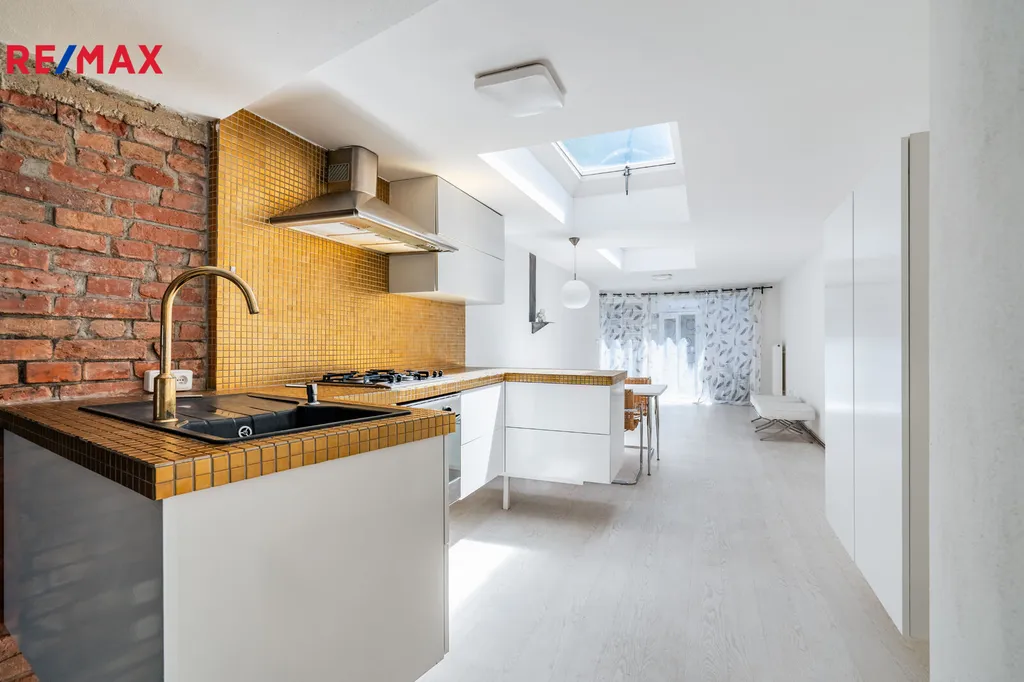 Řadový, patrový rodinný dům 2+kk s otevřenou dispozicí - loft, Blučina, ul. Komenského. Celková plocha pozemku 181 m2, užitná plocha domu cca 95 m2.