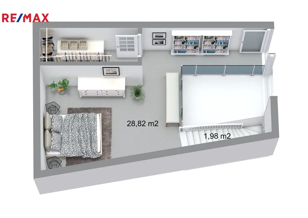 V přízemí šatna, hala se schodištěm, navazuje kuchyň, jídelní kout a obývací pokoj. Odtud vstup na dvorek a sklípek. Zahrada je ve svahu. V horním patře je pak ložnice a WC.