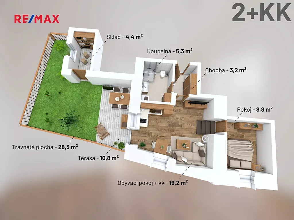 Dispozice tohoto menšího apartmánu 2kk, nacházejícího se v přízemí objektu, nabídne dostatečný komfort pro 2- 4 osoby. Tento apartmán může mít po drobných úpravách bezbariérový přístup. Značným benefitem je prostorná terasa, na kterou navazuje oplocená zahrádka s vlastním vstupem a skladovacím prostorem pro sportovní potřeby. Na terase a zahrádce orientované na jihozápad můžete krom posezení a grilu umístit třeba houpačku, pískoviště nebo menší bazén pro děti.