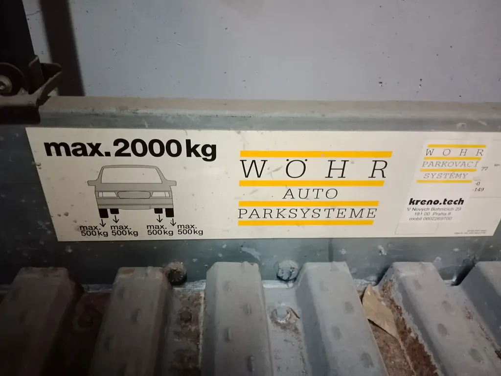 Pronájem garážového stání v suterénu činžovního domu. Systém parklift horní stání. Vjezd dálkově ovládaná vrata.