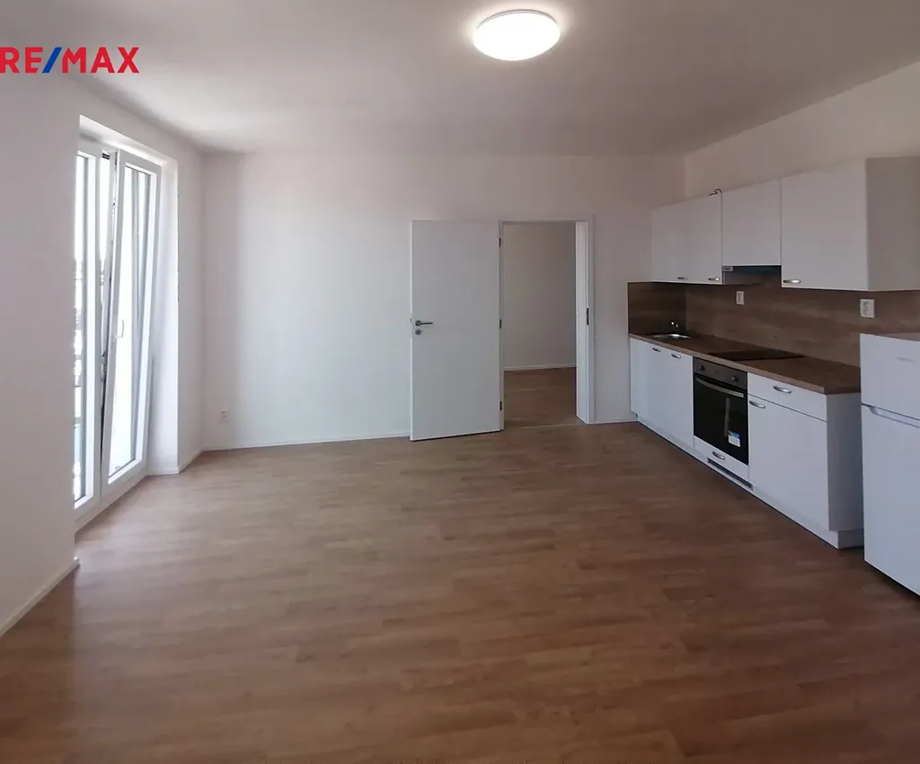 Byt se sestává ze vstupní předsíně, obývacího pokoje s kuchyňským koutem, balkónem, ložnice s balkónem a koupelny s WC. K bytu patří sklepní kóje v přízemí domu (2,2 m2) a dále venkovní parkovací stání.